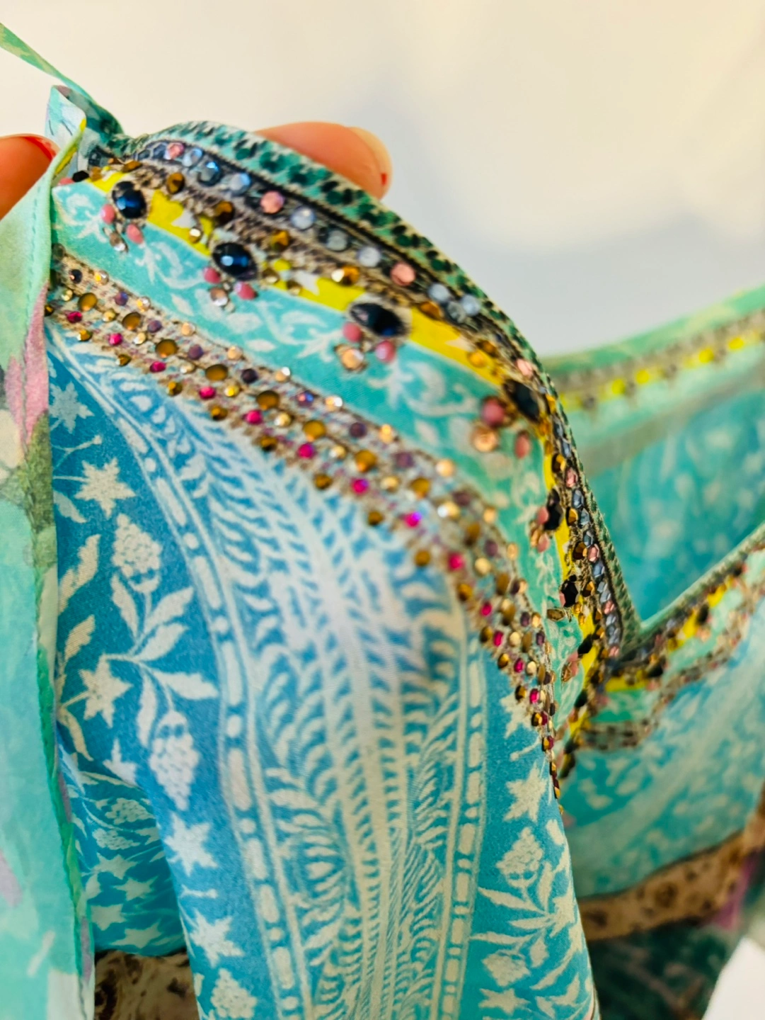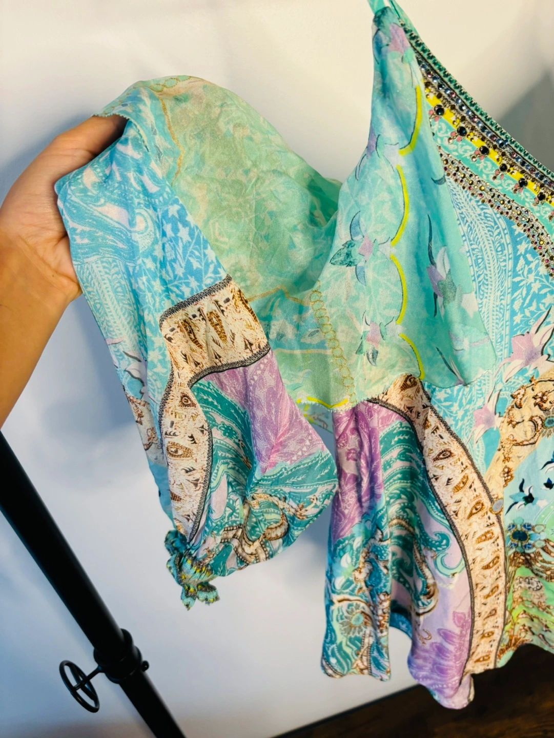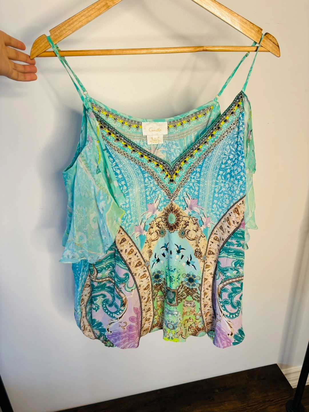 Beautiful off the shoulder designer top with a colourful, floral print. Has a beaded detail around the neckline and has a flowing fit. Purchased for $150.
