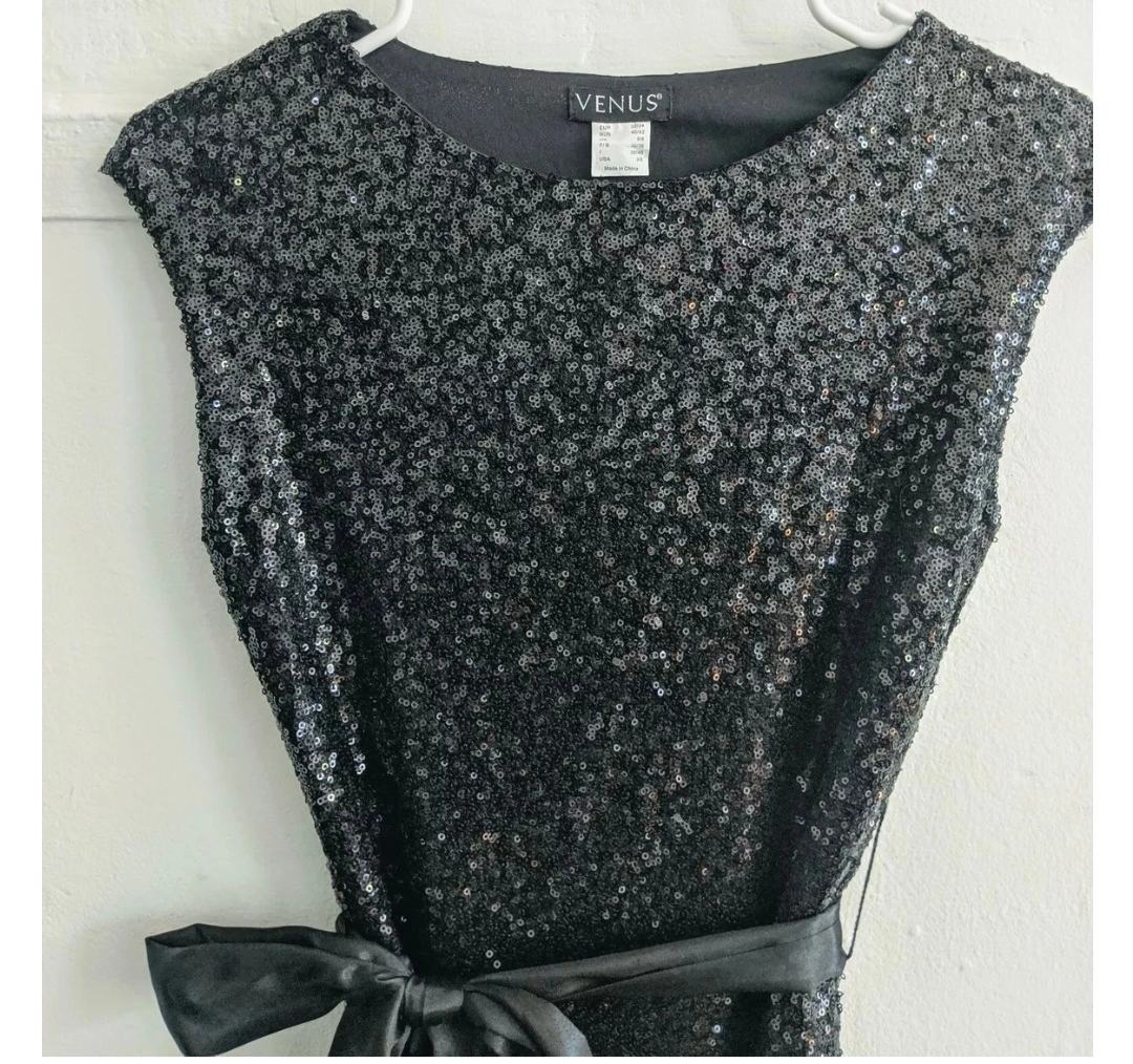 Black sequin dress with a satin tie. Sleeveless, fitted, and knee-length.