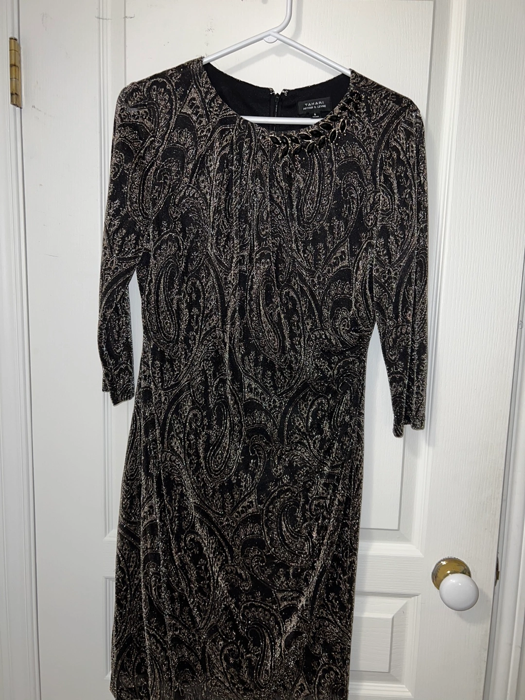 Black and gold dress with a jeweled neckline. Three-quarter sleeves. Size 8.