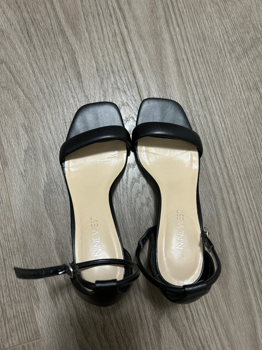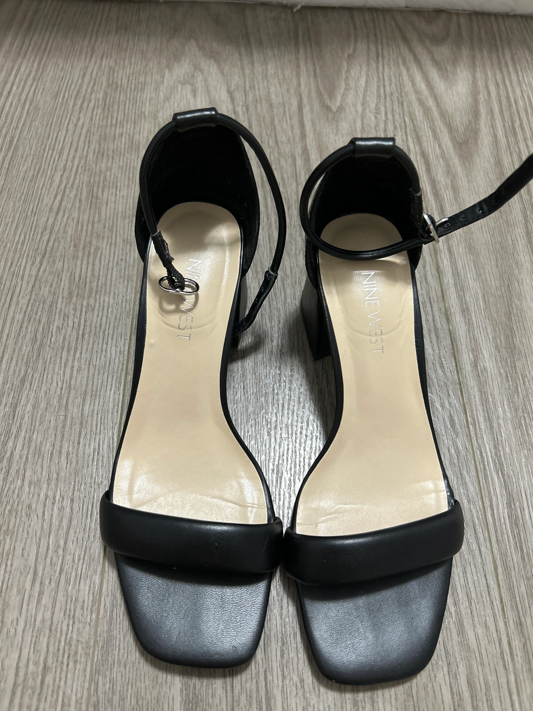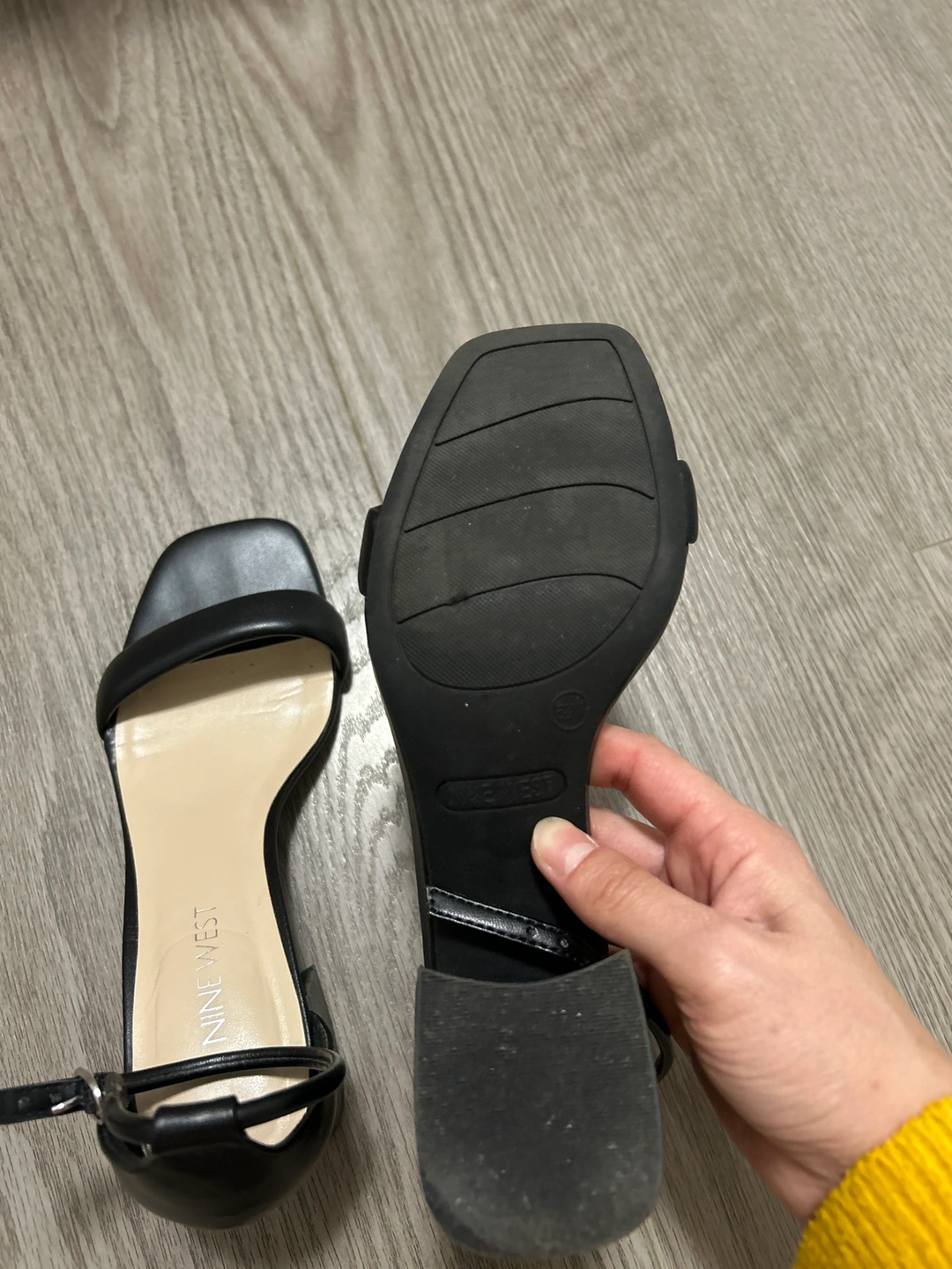 158Black leather heeled sandals. Square toe, ankle strap, and block heel. Size 36