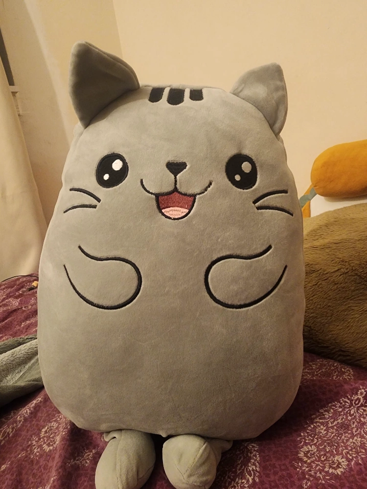 Description: Super soft and squishy gray cat plush with an adorable smile! Ideal for hugs, bedroom decor, or as a gift for cat lovers.