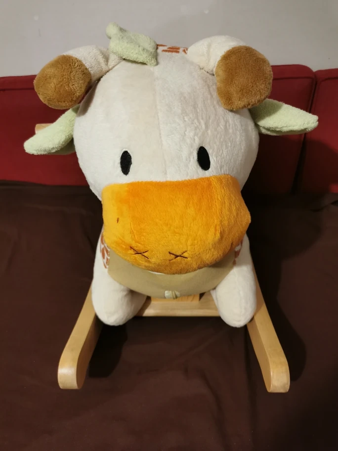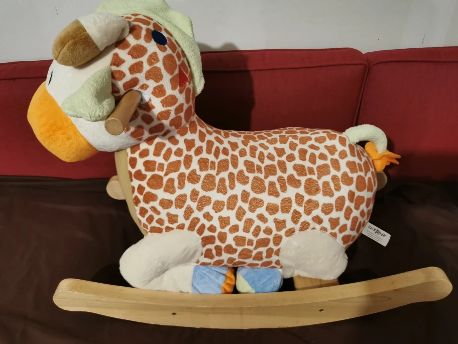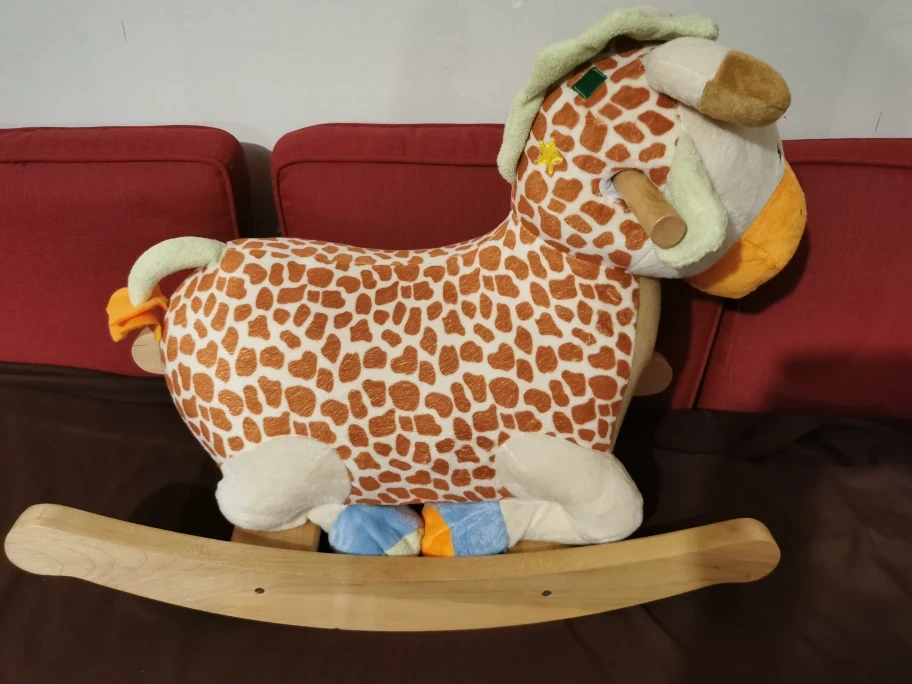 Plush giraffe rocking horse, music buttons. Wooden base with a soft plush giraffe. Perfect for a child's room.