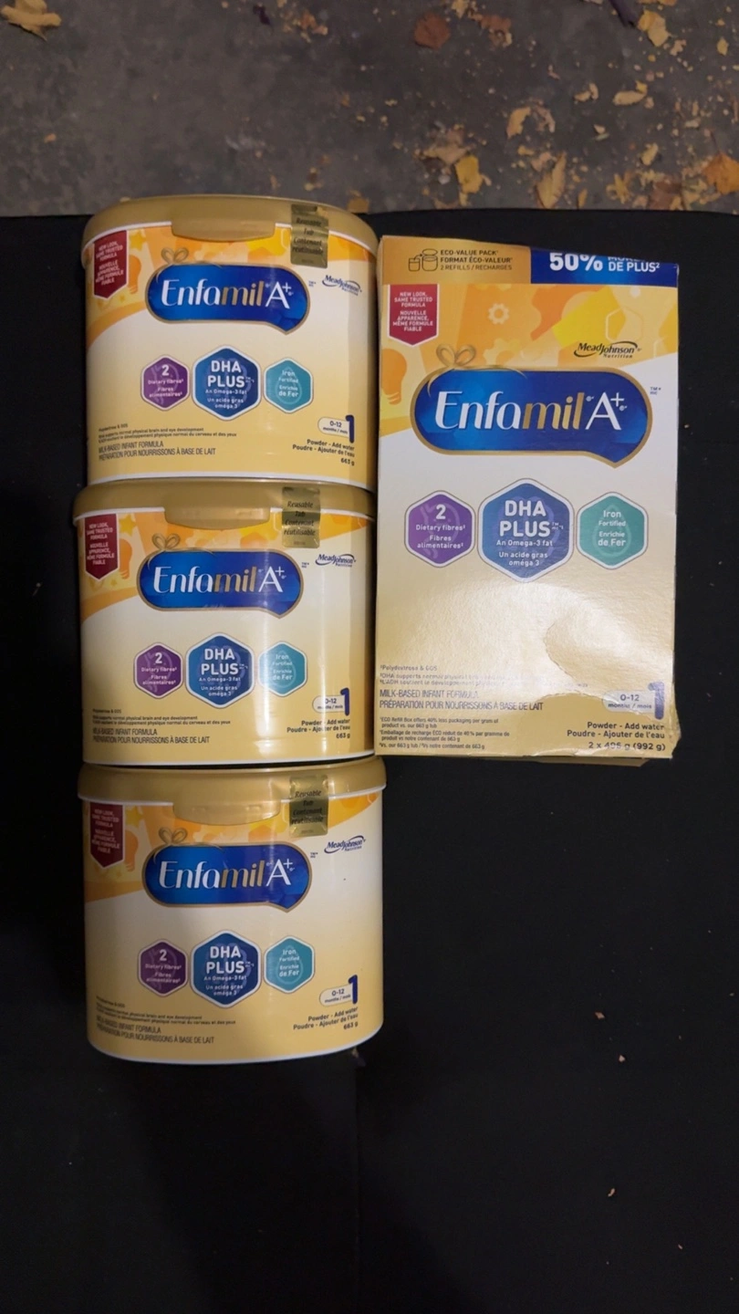 Enfamil A+ infant formula. Stage 1 powder. 3 cans. And one box