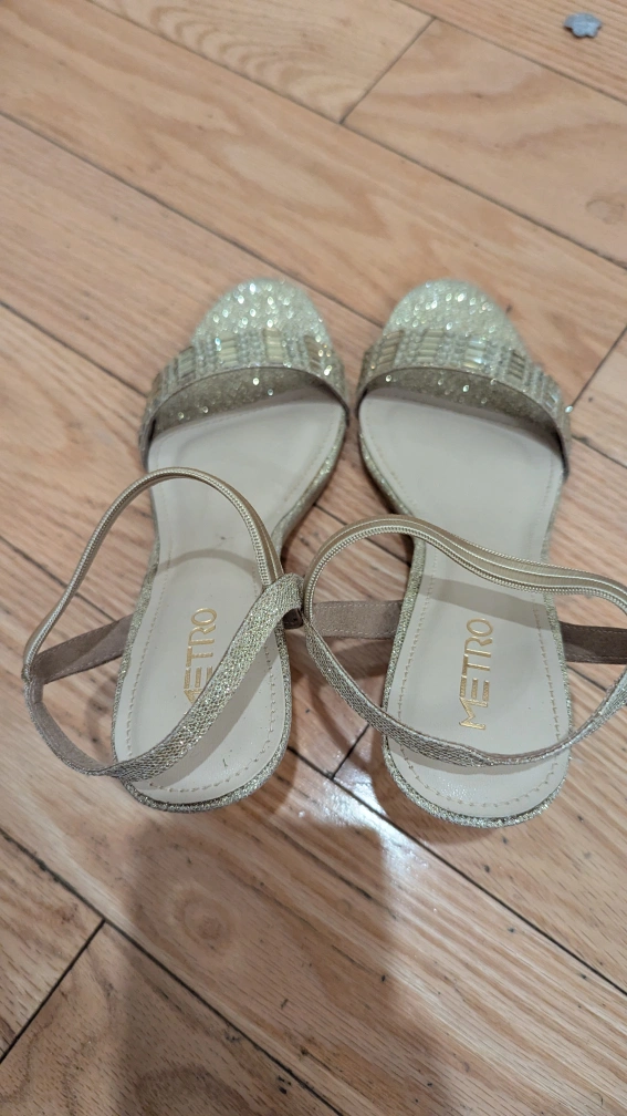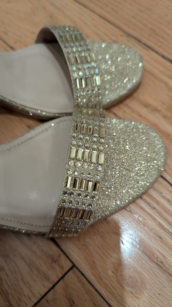 Gold glitter heels with a golden heel. They have a strap around the ankle and feature a crystal embellishment.