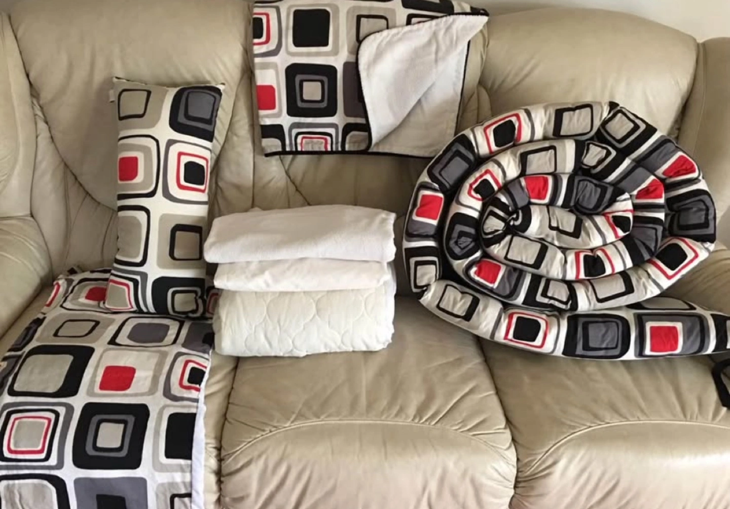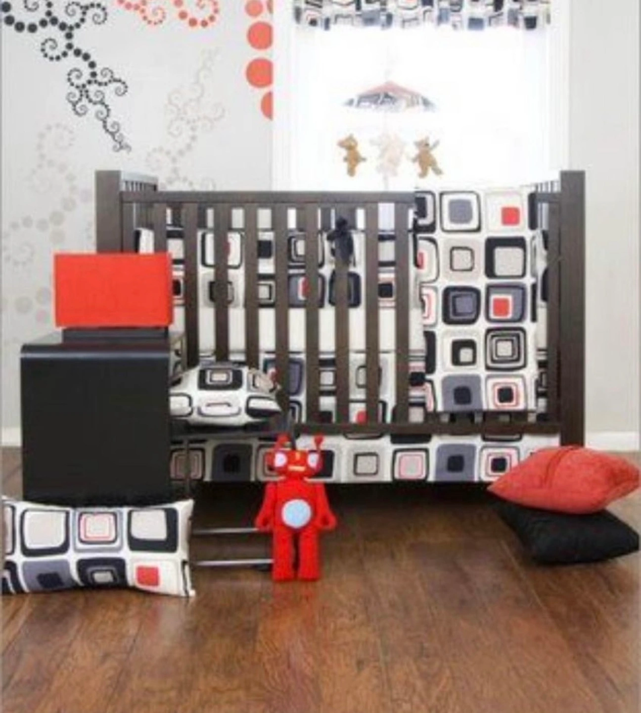 35Crib bedding set includes a fitted sheet, quilt, two decorative pillows, and a bumper. Geometric black, grey, and red pattern. Great condition