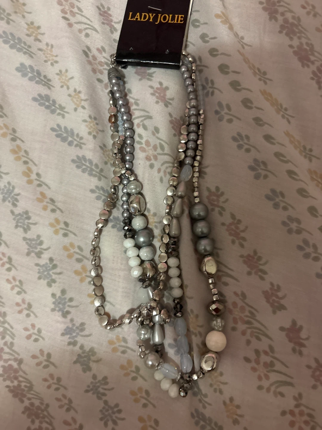 A stylish multi-strand necklace from Lady Jolie. It features a mix of silver, white, and grey beads with some pearlescent and light blue accents. This statement piece adds a touch of elegance to any outfit. It's perfect for dressing up a casual look or complementing evening wear.