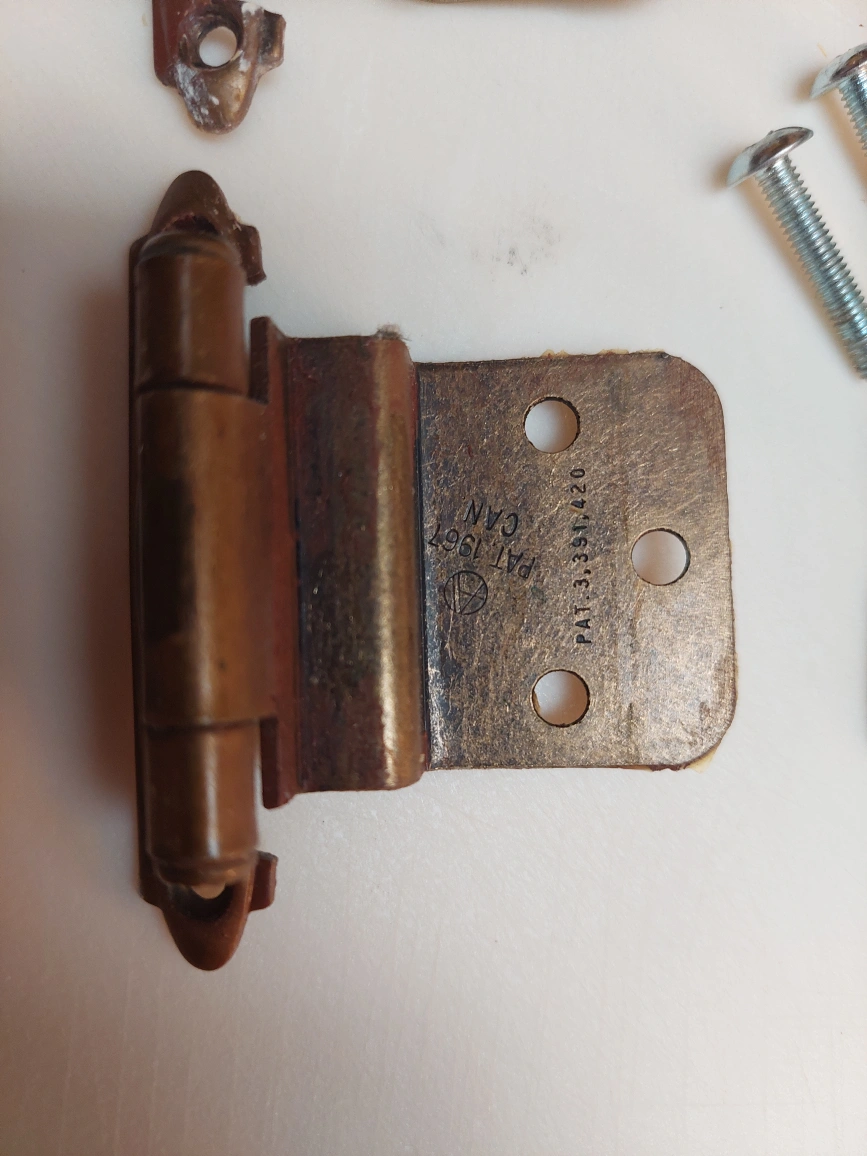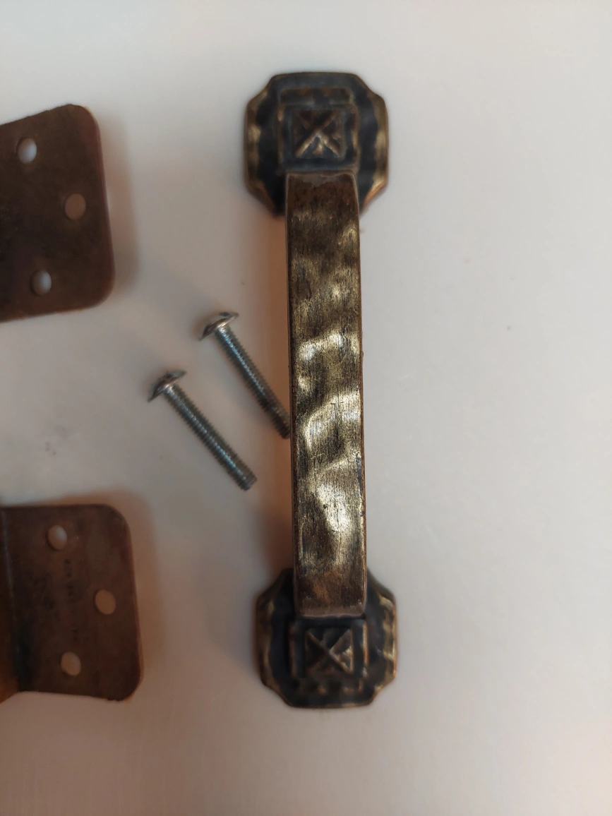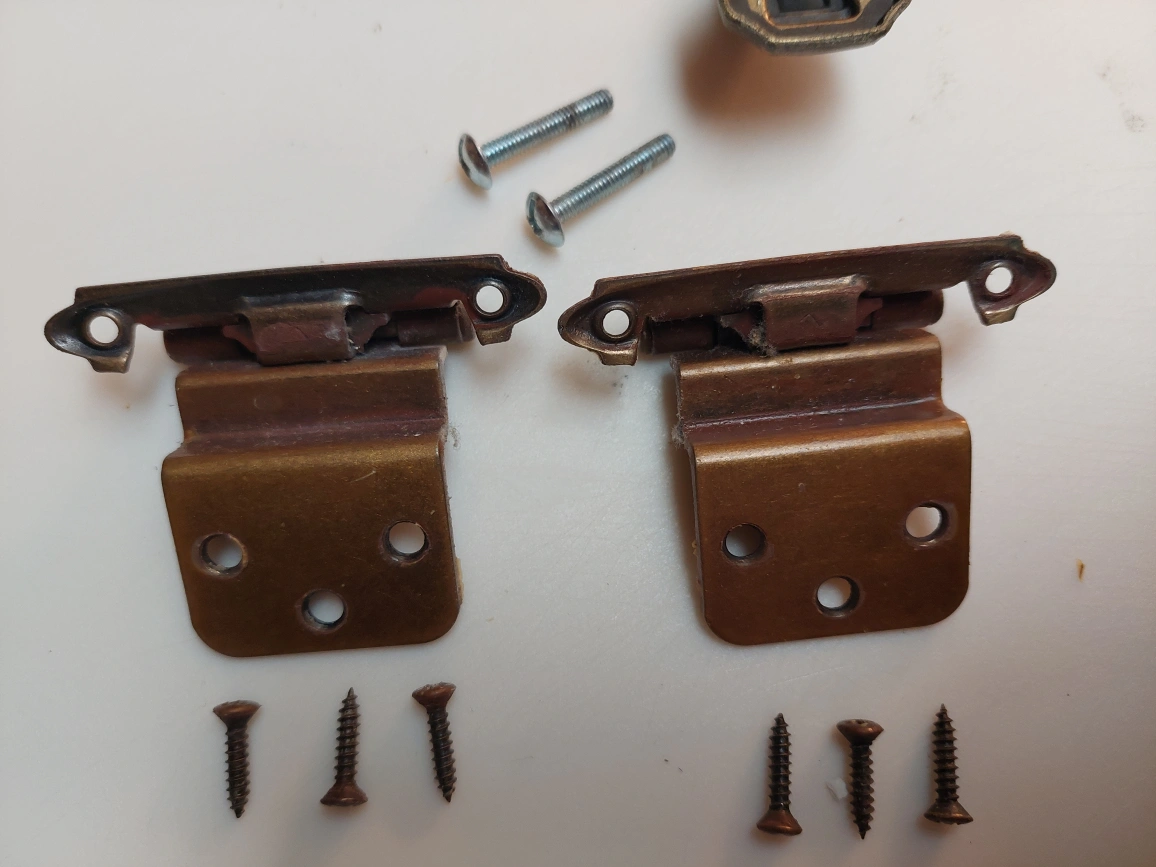 Set of 2 cabinet door hinges and one cabinet door pull. All items are in good condition, with normal wear from use. Includes screws. Currently, approximately 25 sets are available. $5.00 per set.