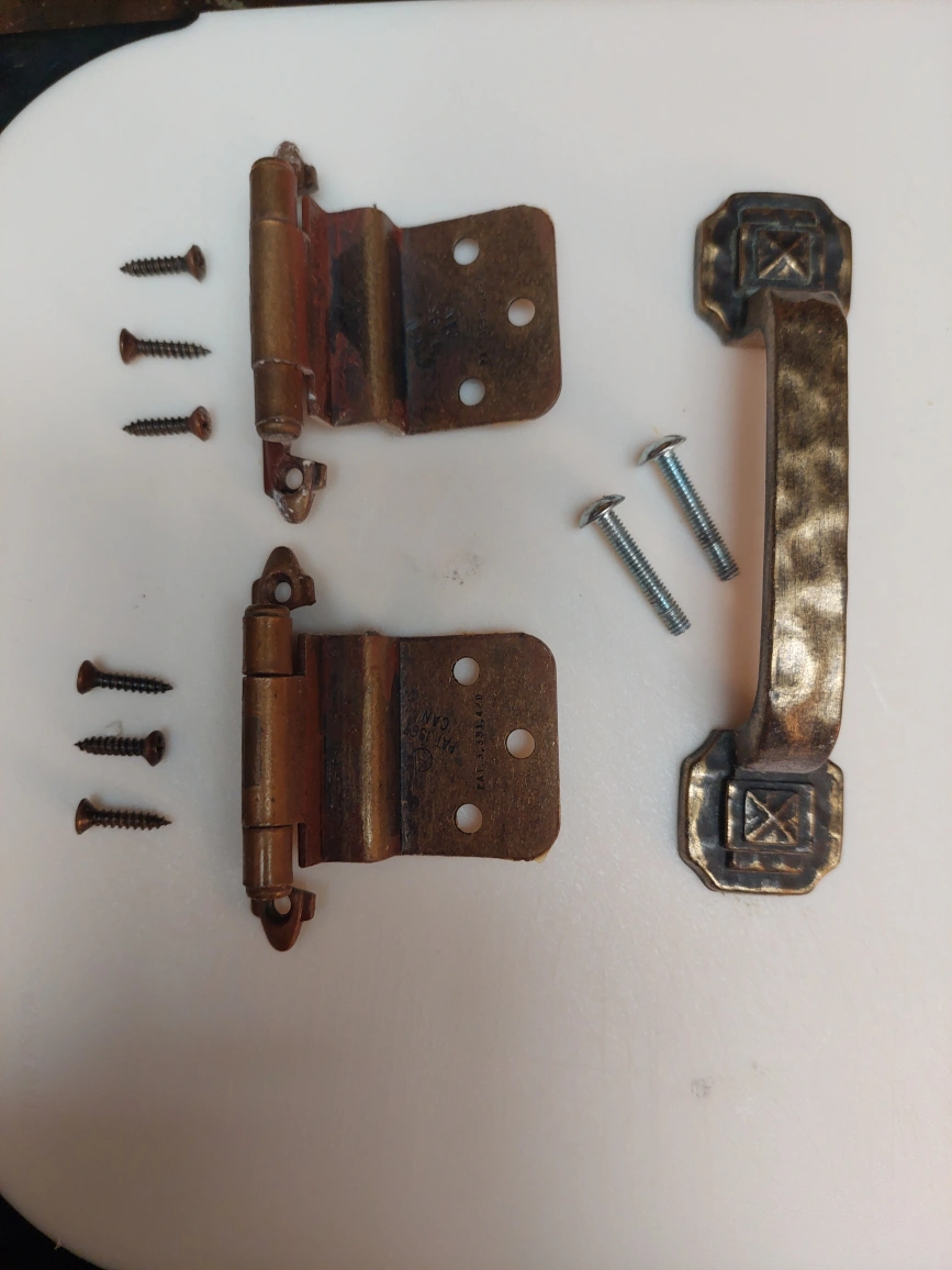 Set of 2 cabinet door hinges and one cabinet door pull. All items are in good condition, with normal wear from use. Includes screws. Currently, approximately 25 sets are available. $5.00 per set.