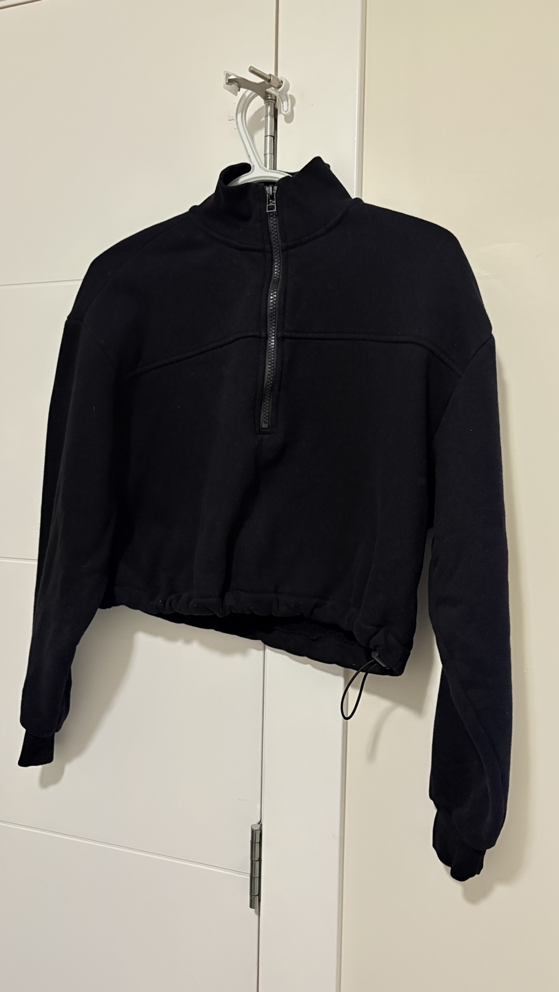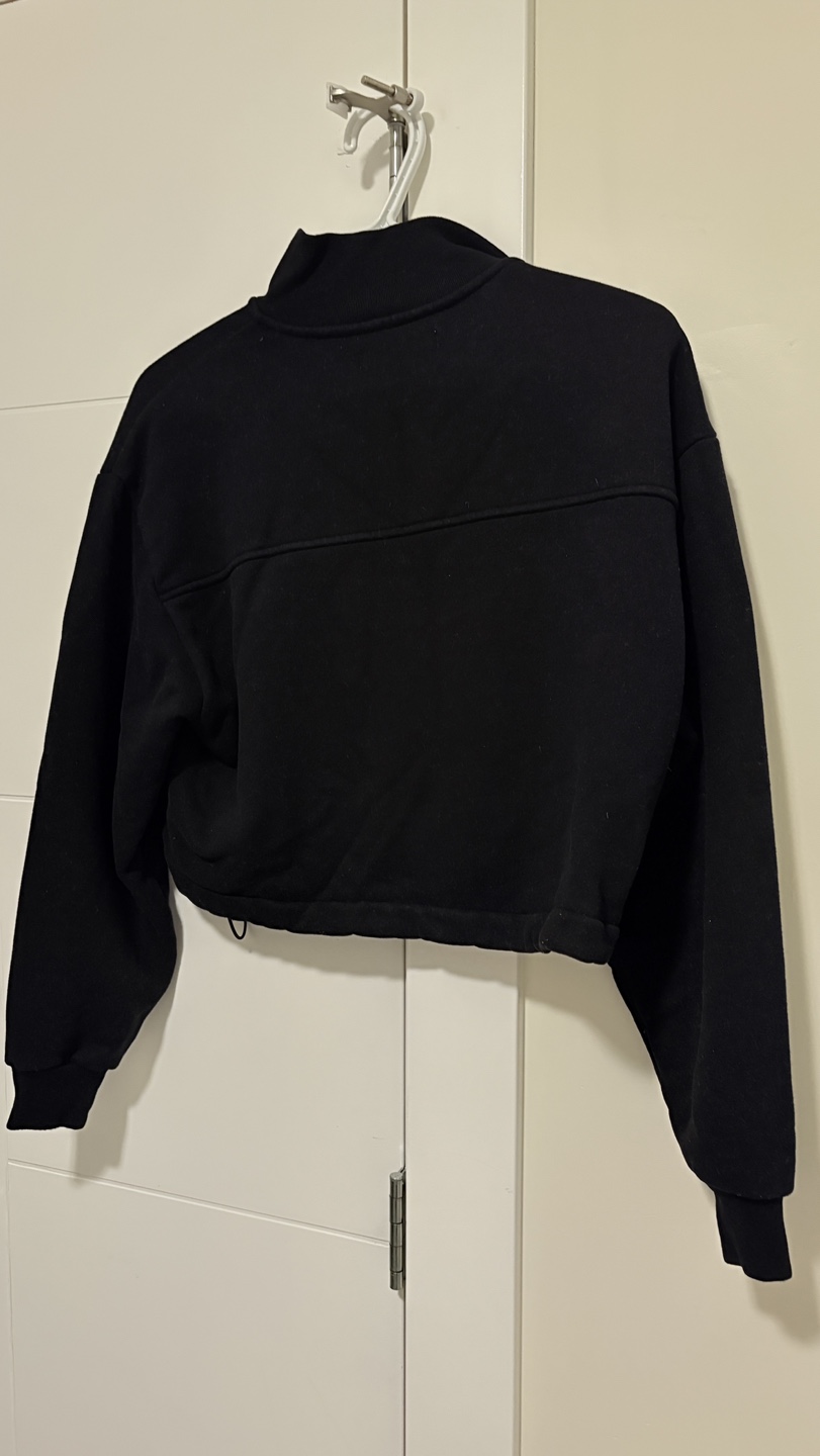 Black cropped sweatshirt with a half zip. Features a drawstring at the bottom and a high neck.