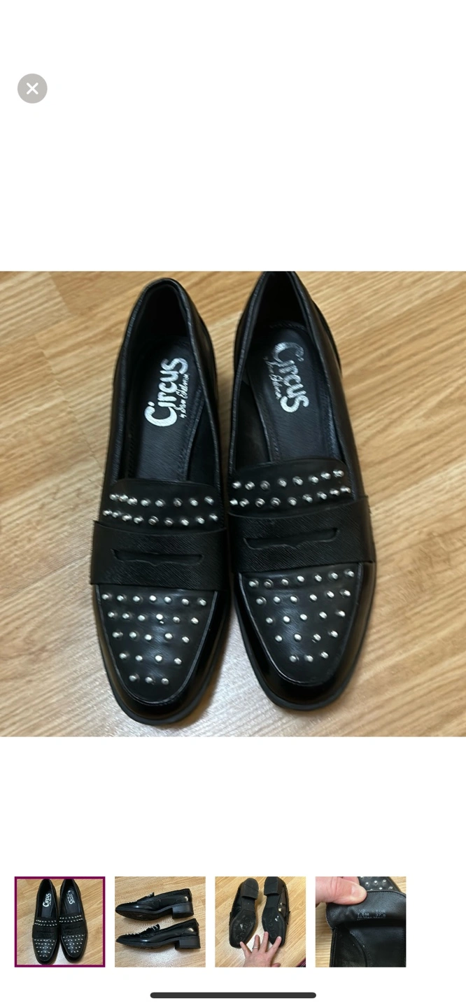 Black leather loafers with silver studs. They are in good condition. Size 7.5M.