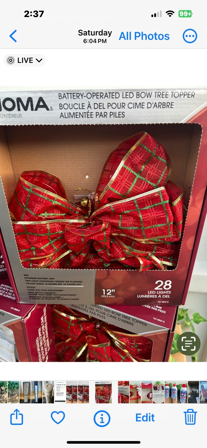 Battery-operated LED bow tree topper. 28 LED lights. 12 inch. Features two light functions: steady or flashing. Extended battery life: 30 hours on, 18 hours off.