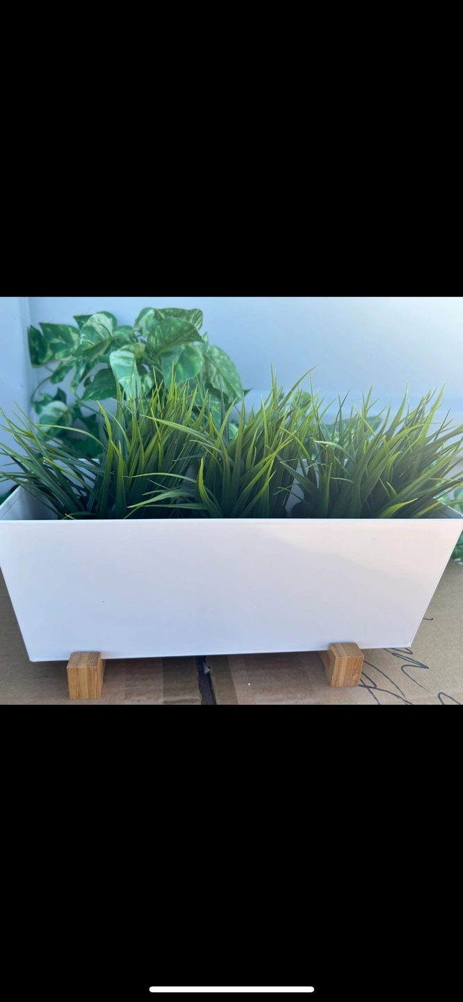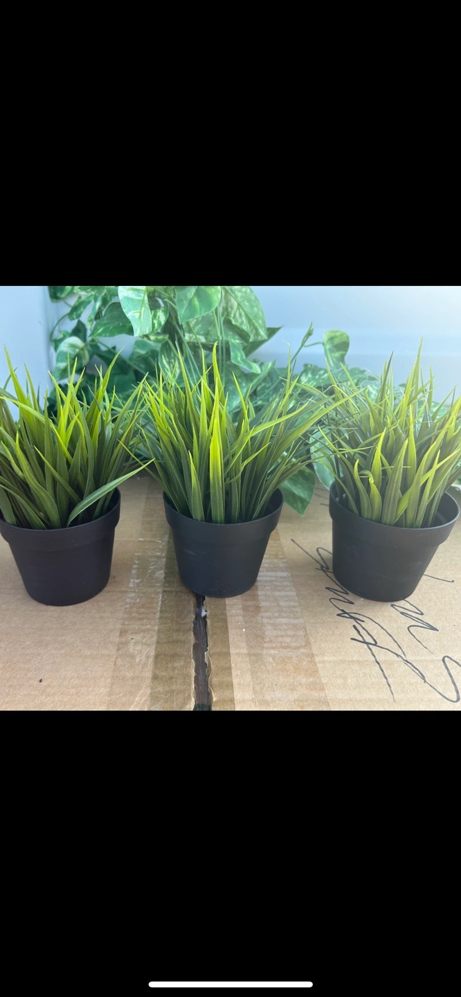 Set of four artificial grass plants, three in small black pots and one larger plant in a white planter with wooden legs. Perfect for adding a touch of greenery to your home without the need for watering.