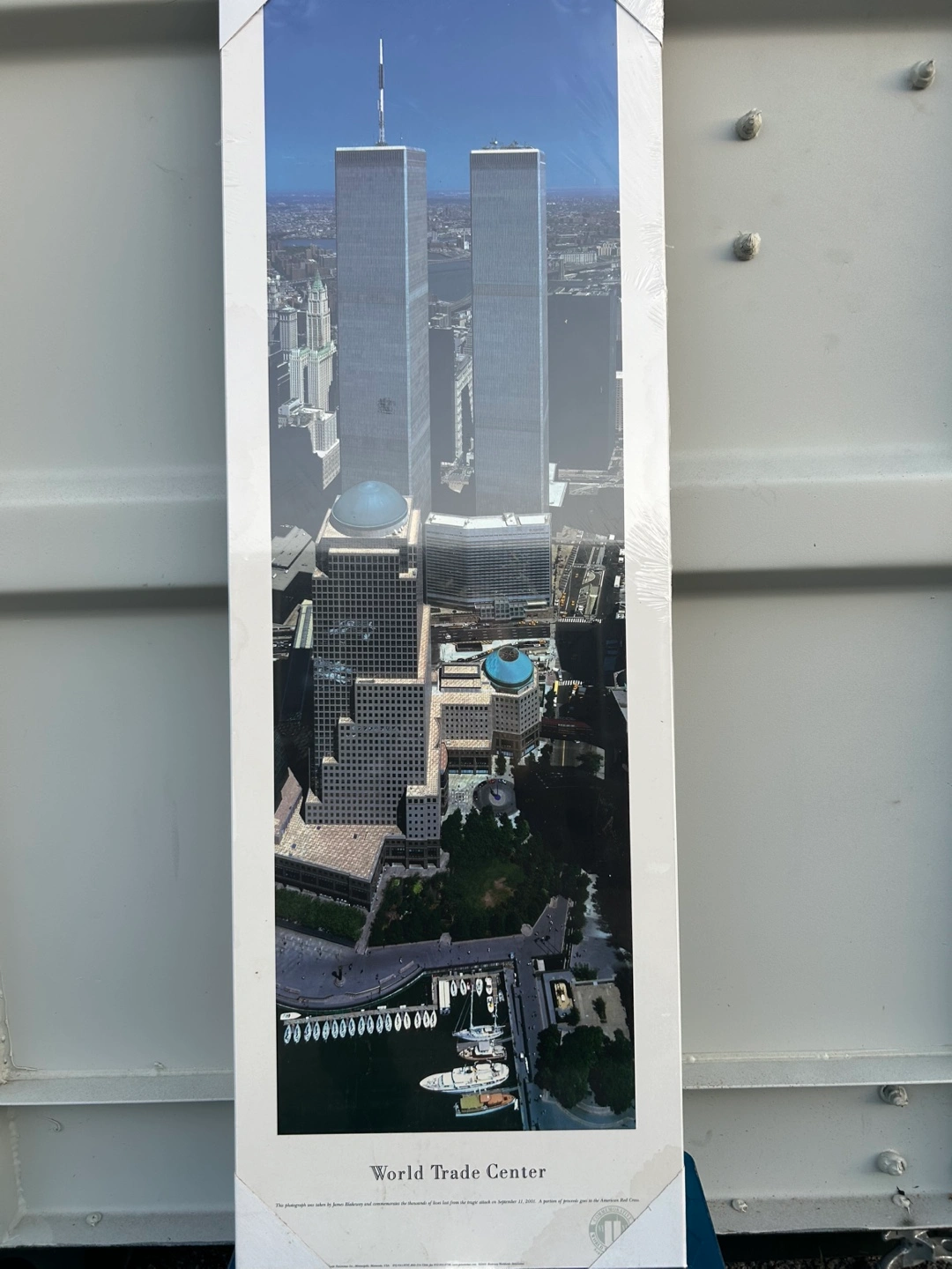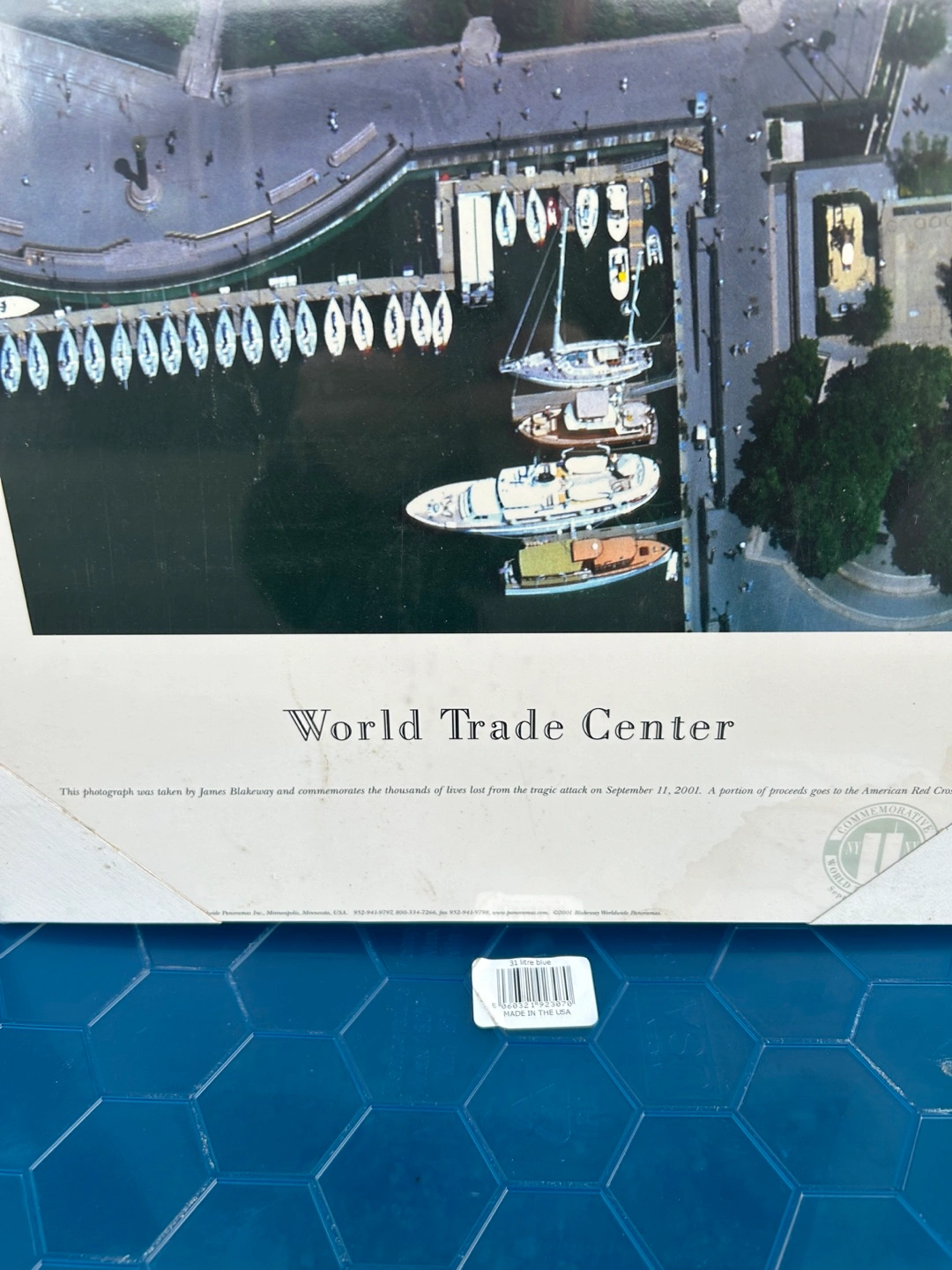 Framed print of the World Trade Center. Taken by James Blakeway and commemorates the thousands of lives lost from the tragic attack on September 11, 2001. A portion of proceeds goes to the American Red Cross.