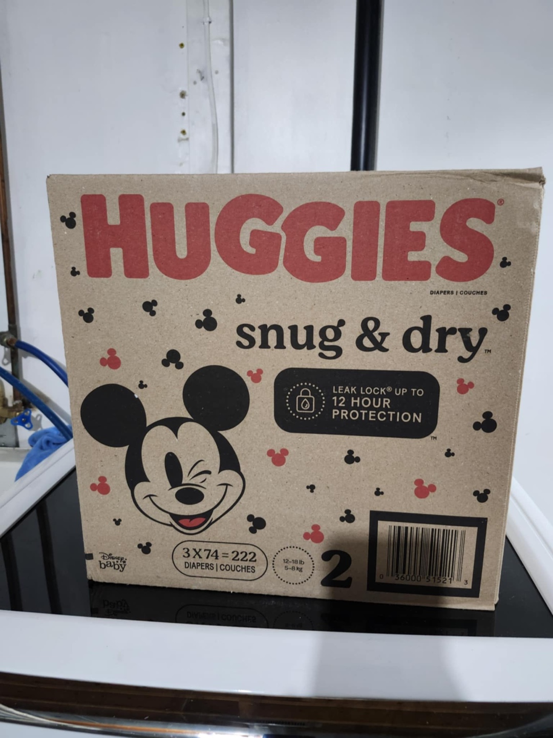 New box of Huggies Snug & Dry diapers, size 2. 3 packs of 74 diapers, 222 diapers total. Mickey Mouse design.
