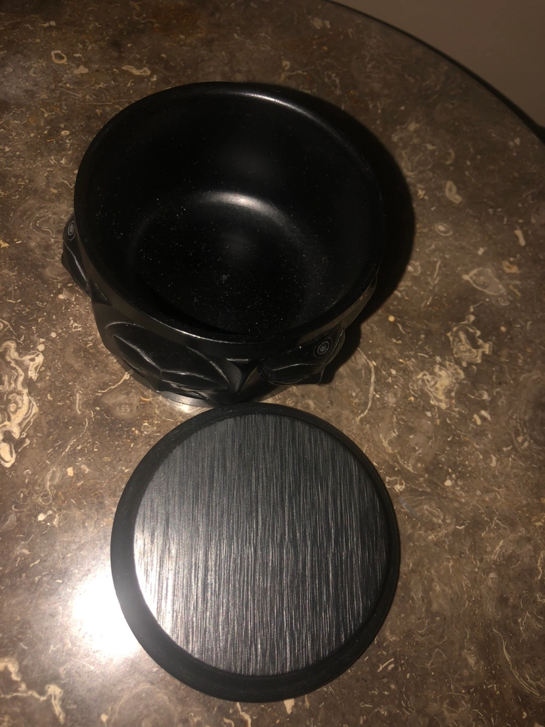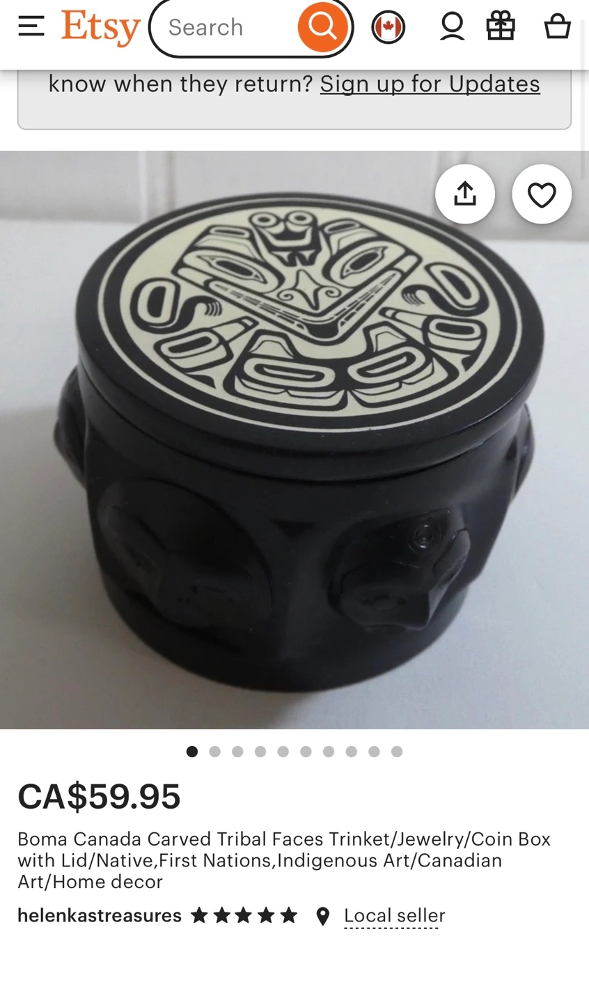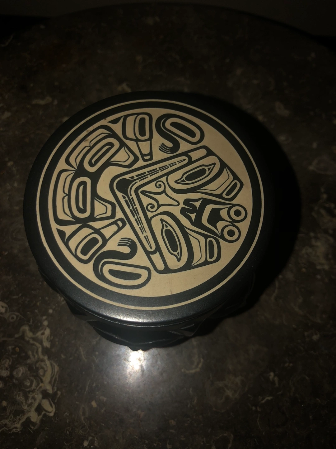 Small trinket box with First Nations design. Carved wooden box with a lid. Approximately 3 inches in diameter.