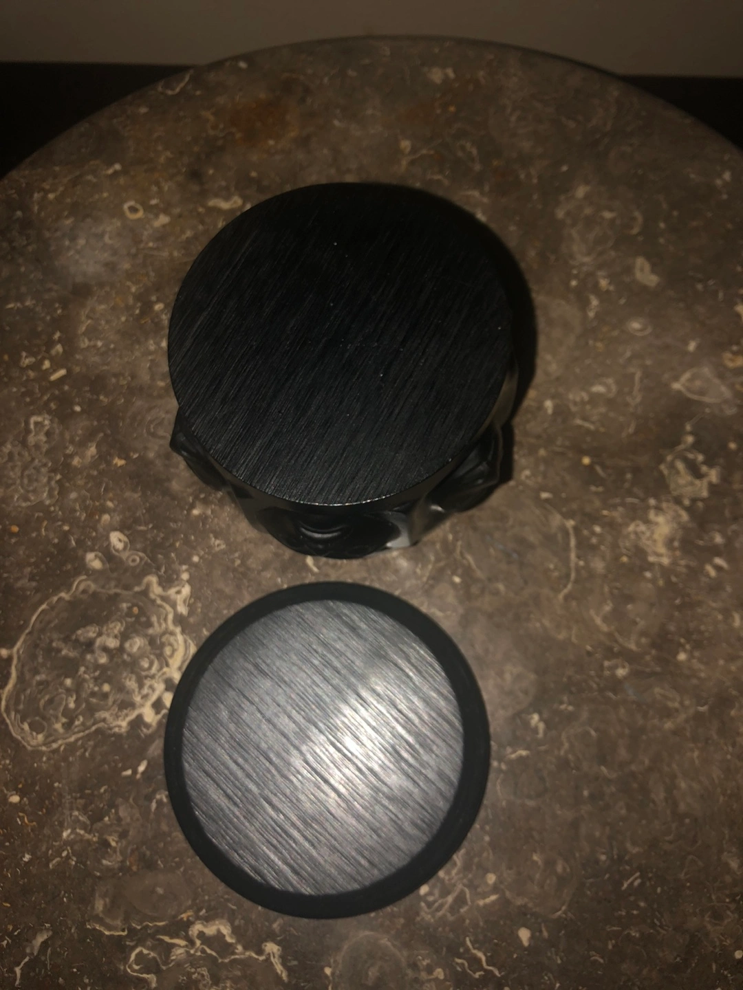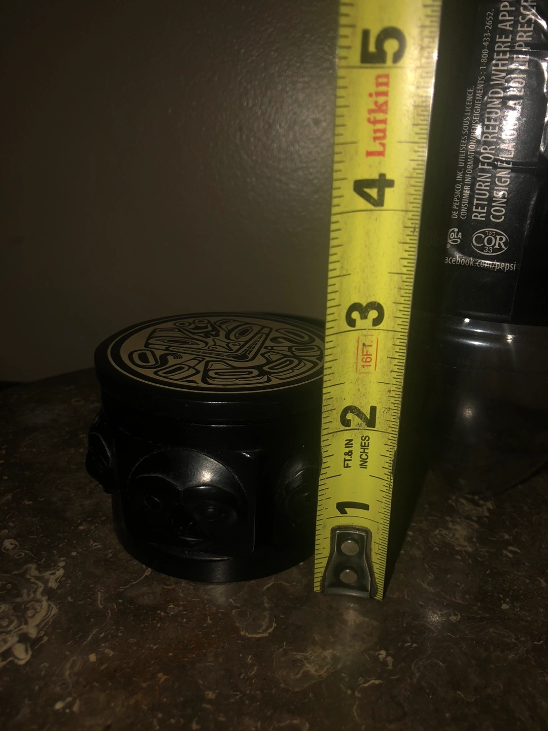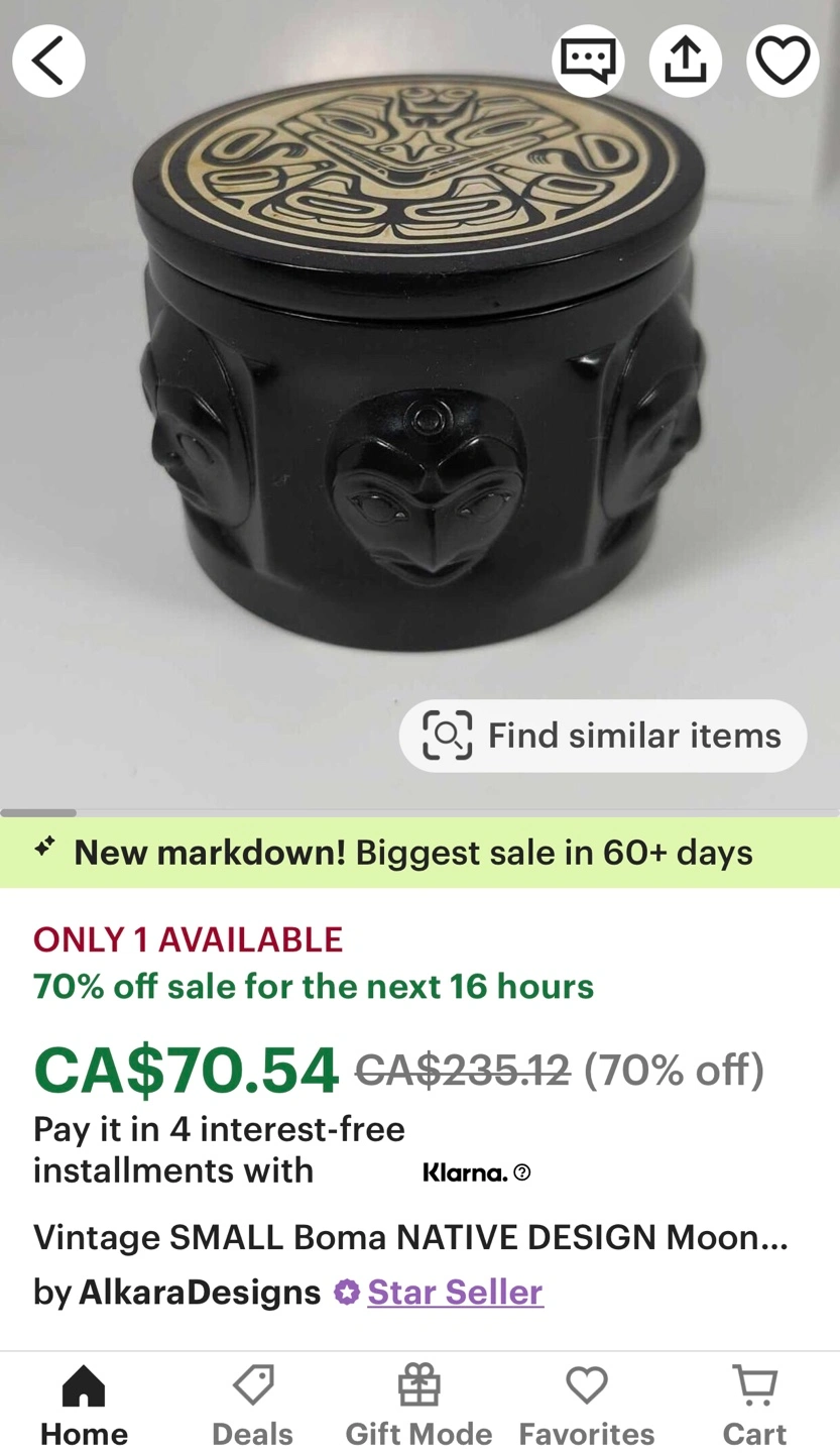 Small trinket box with First Nations design. Carved wooden box with a lid. Approximately 3 inches in diameter.