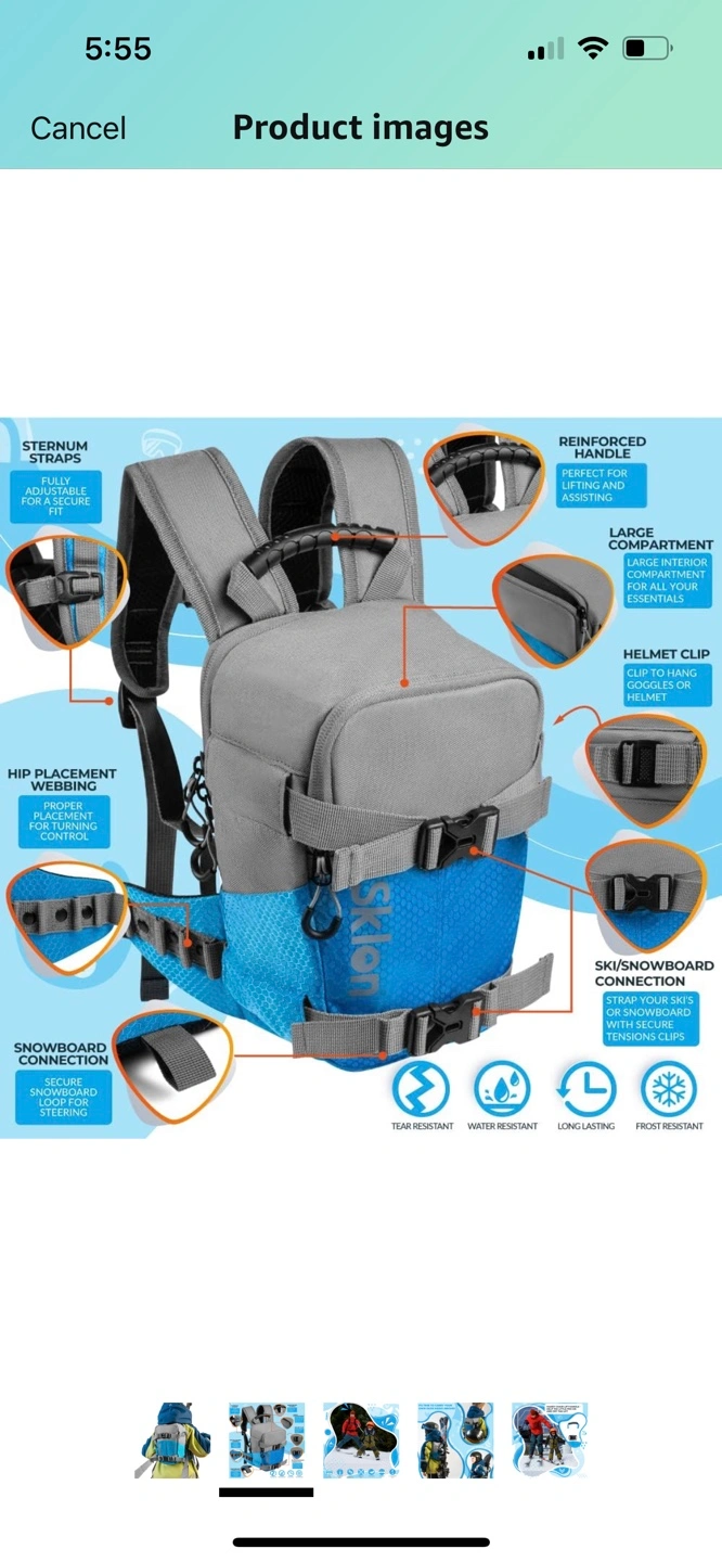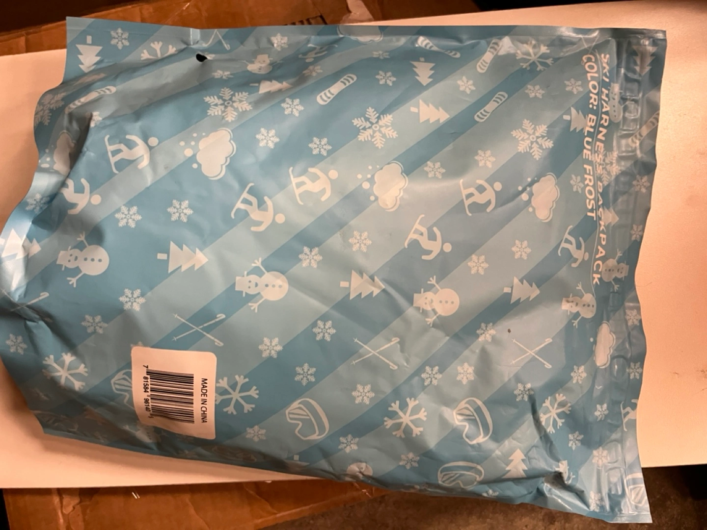 Grey and blue ski harness backpack. Features reinforced straps, a large interior compartment, and a helmet clip. Padded hip belt. Tear-resistant, water-resistant, long-lasting, frost-resistant.