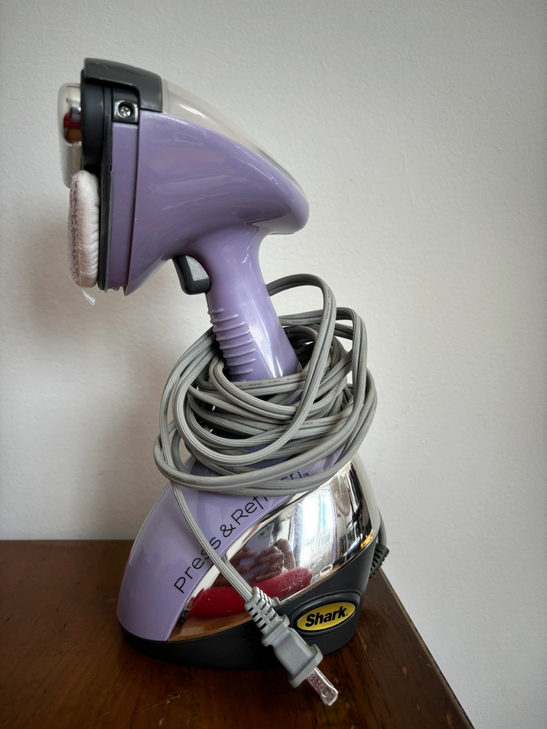 Purple Shark Wrinkle Eraser Press & Refresh Garment Steamer GS500CNN. Includes a variety of attachments and a user manual.