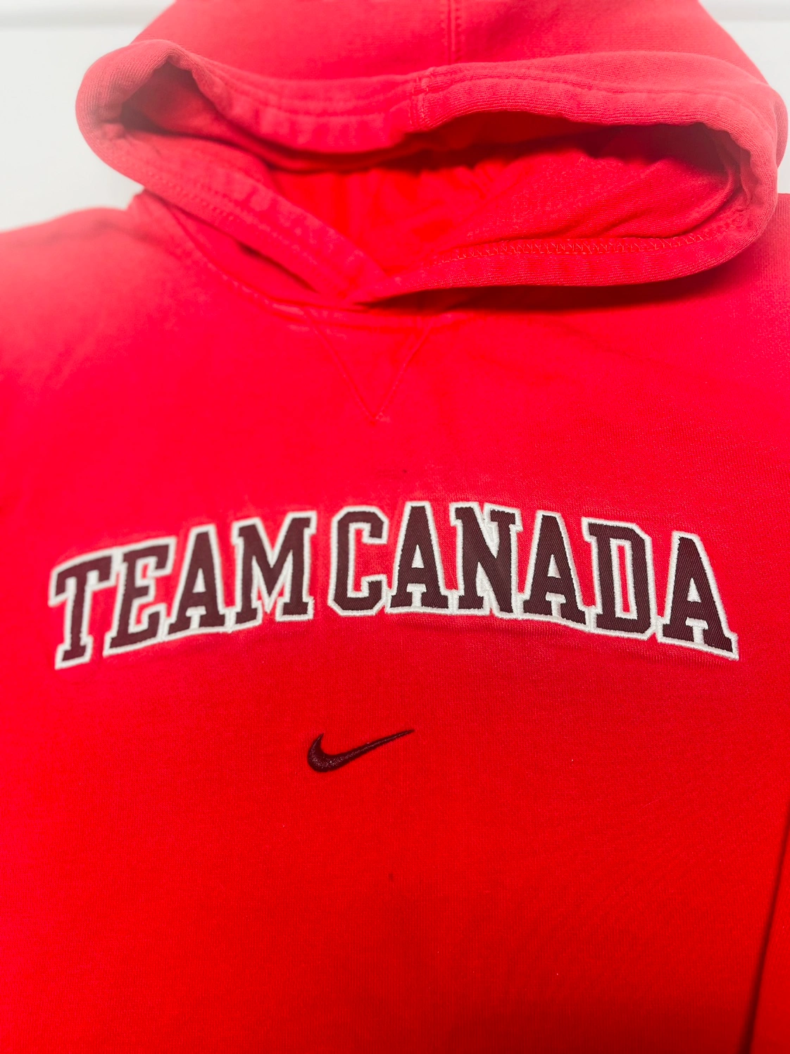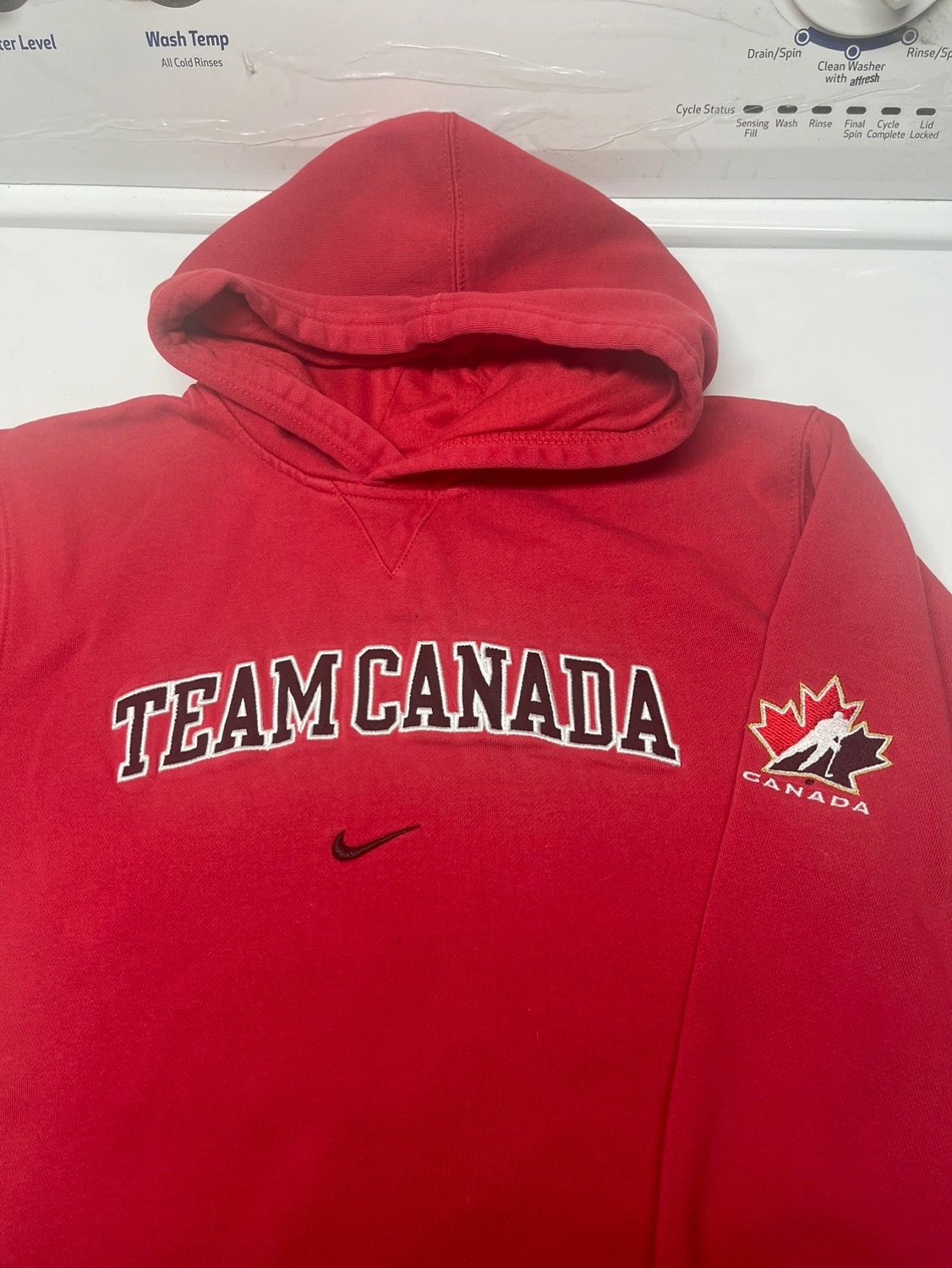 BAUER SIZE SMALL Red hoodie featuring Team Canada and a Nike swoosh. Embroidered patches on the front and sleeve.