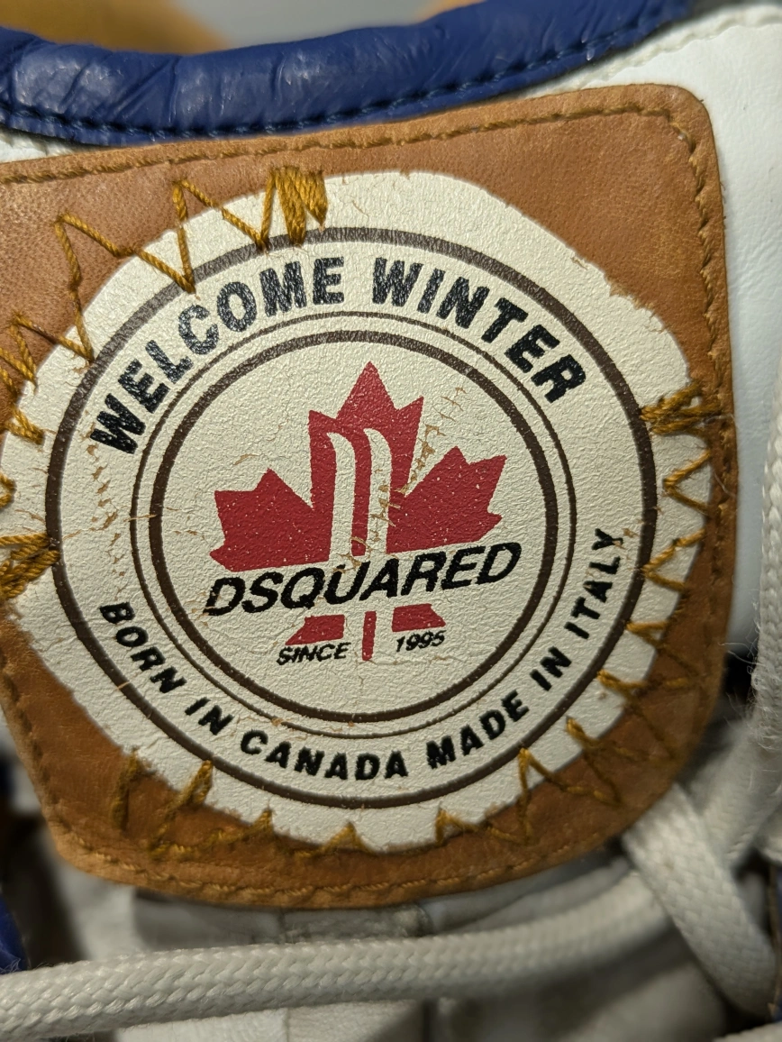 White leather high top sneakers with blue trim and gold accents. Brown suede accents and brown laces. Welcome Winter logo on the tongue. Size 7