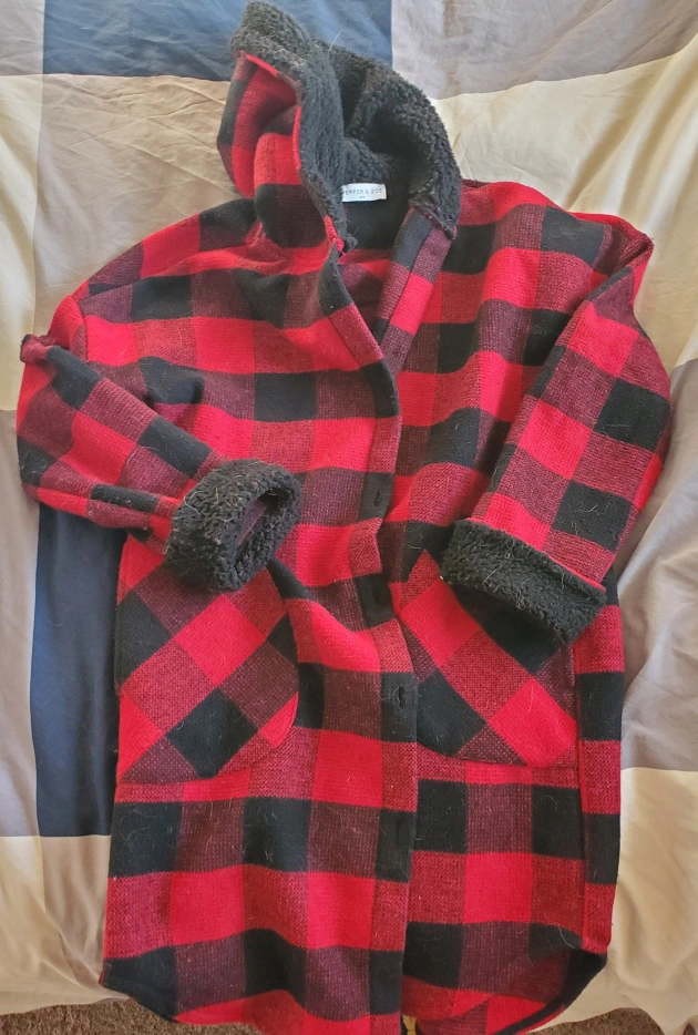 Red and black plaid jacket with fleece lining. Features a hood and pockets. only worn a handful of times, just not my style. dog friendly home