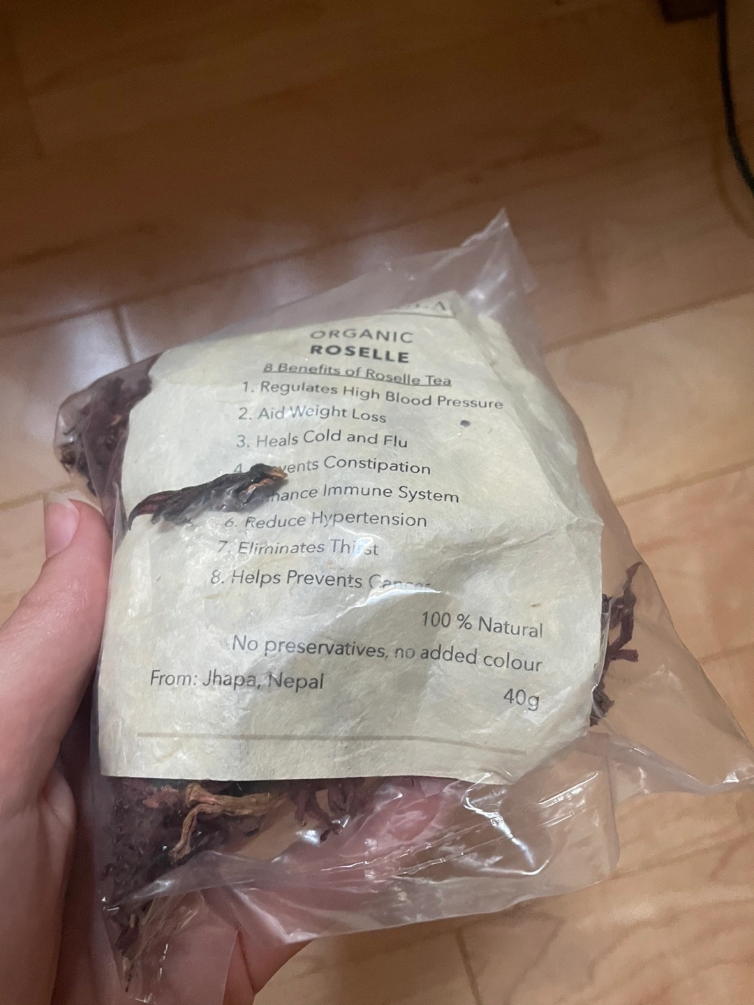 40g of organic roselle tea. 100% natural, no preservatives or added colour. From Nepal.