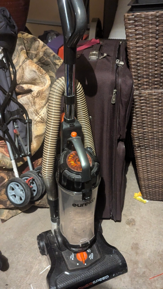 Upright vacuum with a hose and extension wand. Comes with a bag and a variety of attachments. Power speed control dial on the bottom.