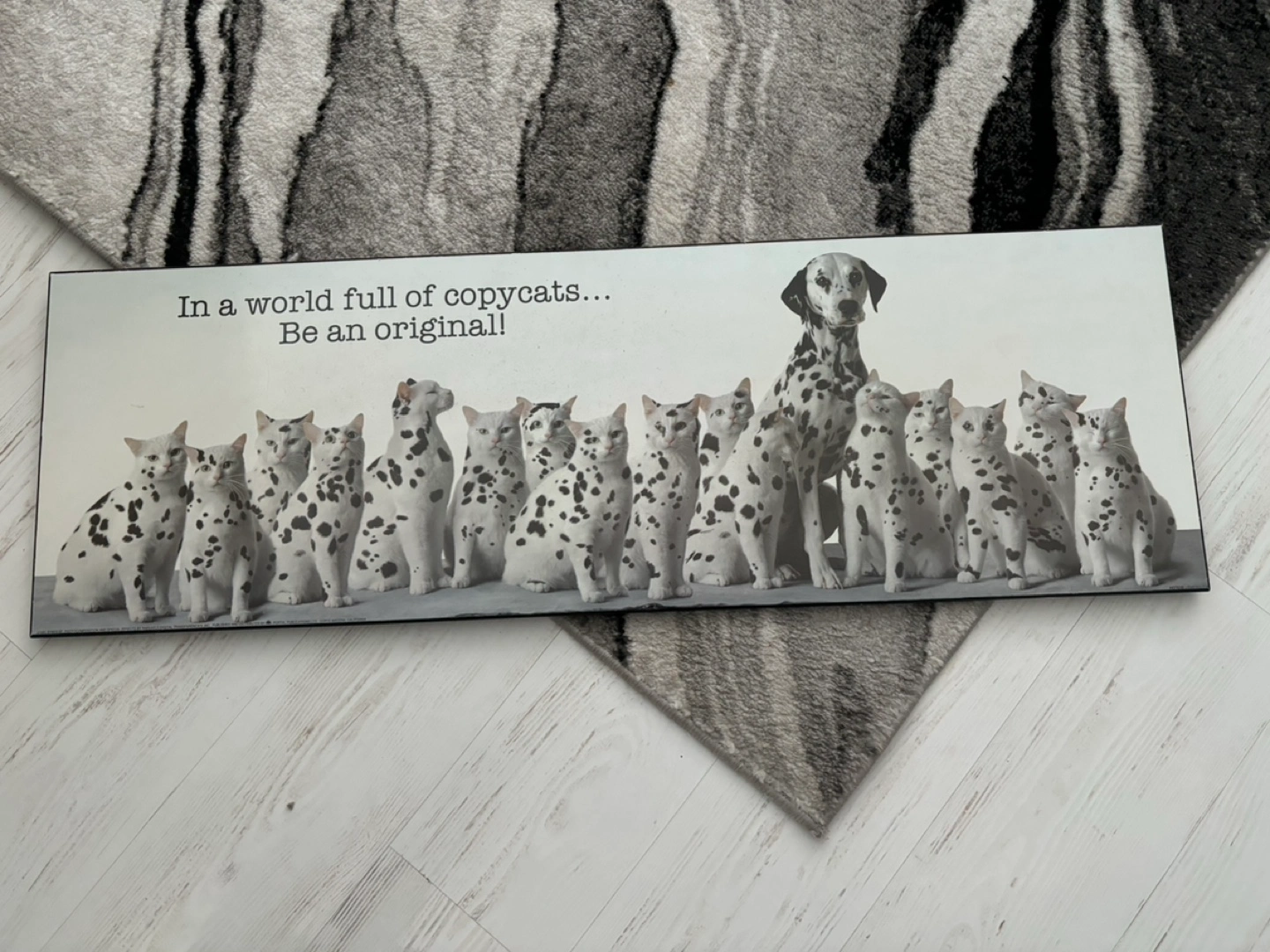 Wall art featuring a Dalmatian dog with the saying 'In a world full of copycats... Be an original!'. Features many Dalmatian cats.