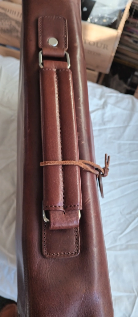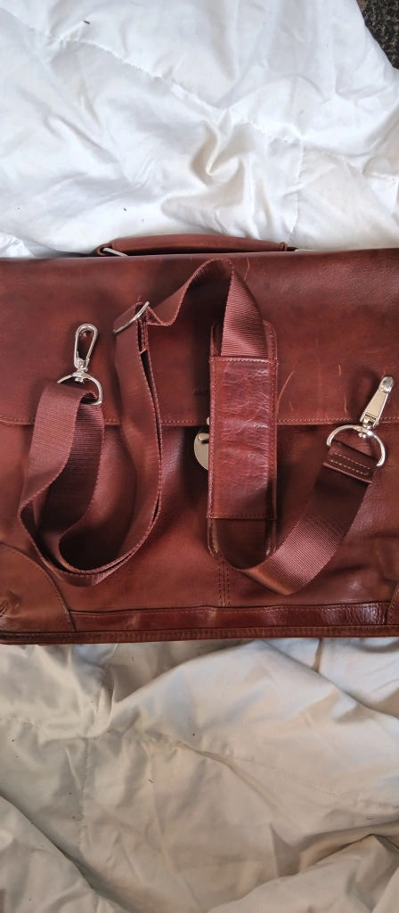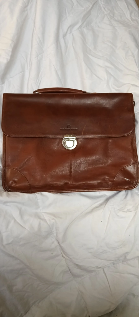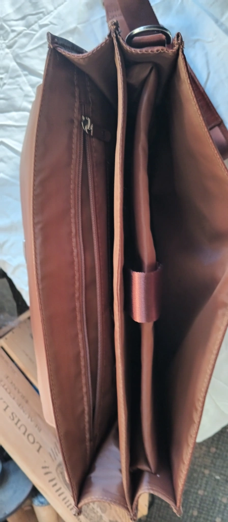 Brown leather briefcase with adjustable shoulder strap, top handle, and interior pocket.