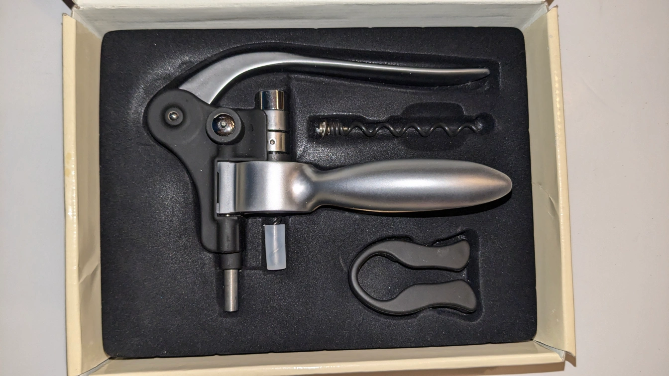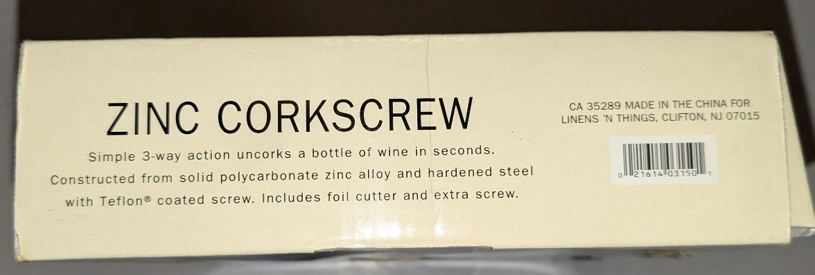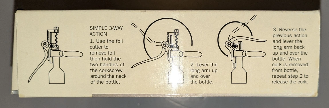 Lever pull corkscrew. Includes foil cutter and extra screw. Three-way action uncorks a bottle of wine in seconds. Constructed from solid polycarbonate zinc alloy and hardened steel with Teflon coated screw. All metal Gears.