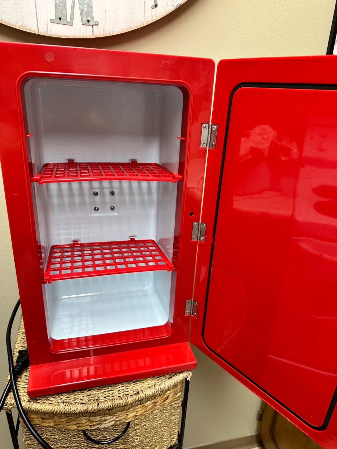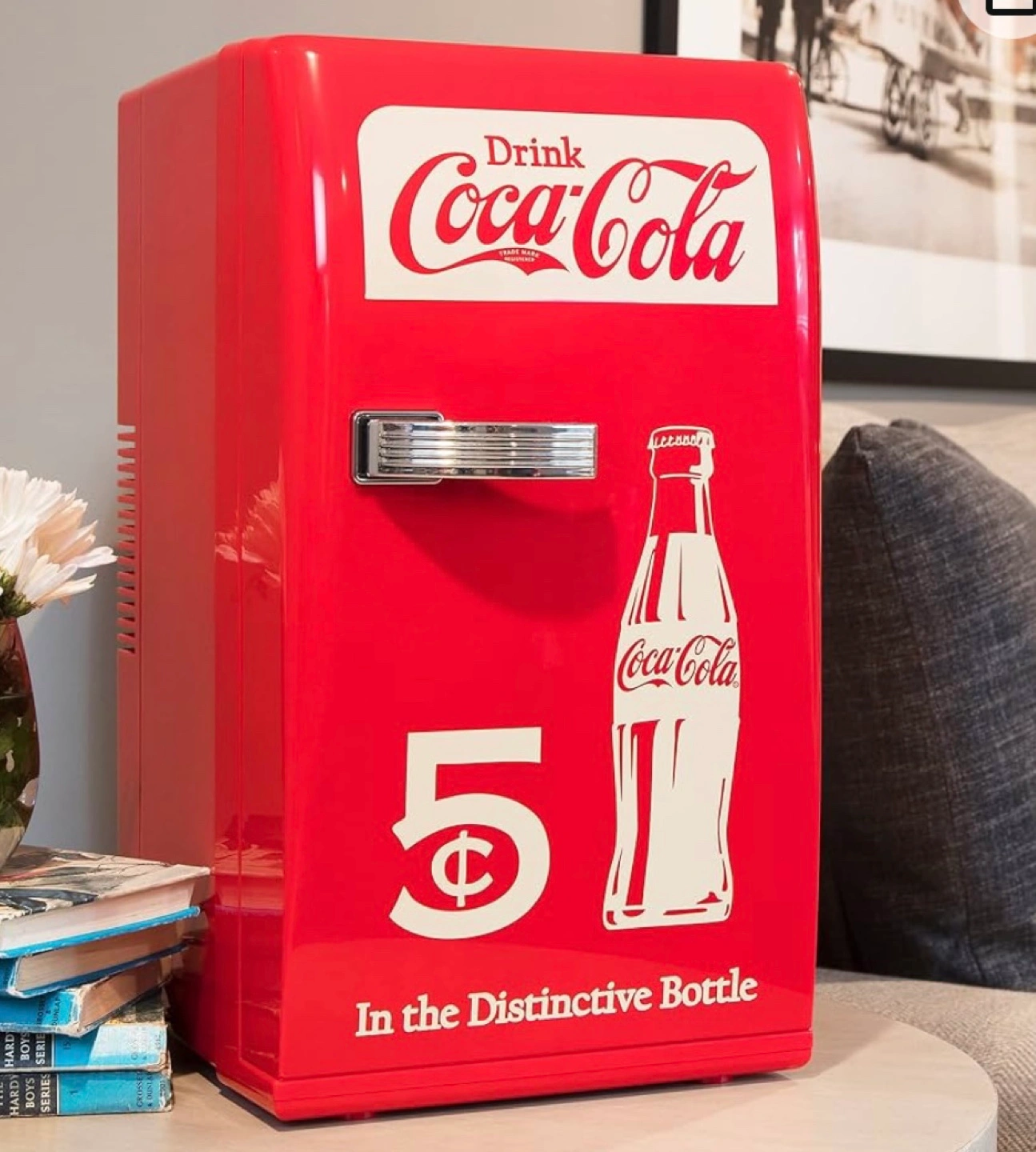 Nostalgic 1950s Fridge Design: Celebrate your favorite soda with vintage Coca-Cola artwork on a vibrant red mini fridge with polished chrome handle modeled after a 1950s style refrigerator