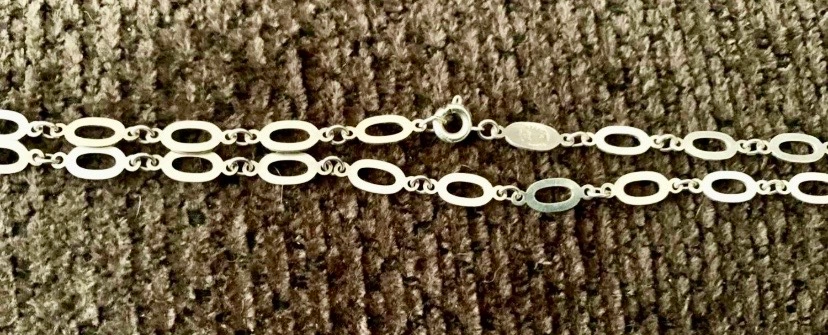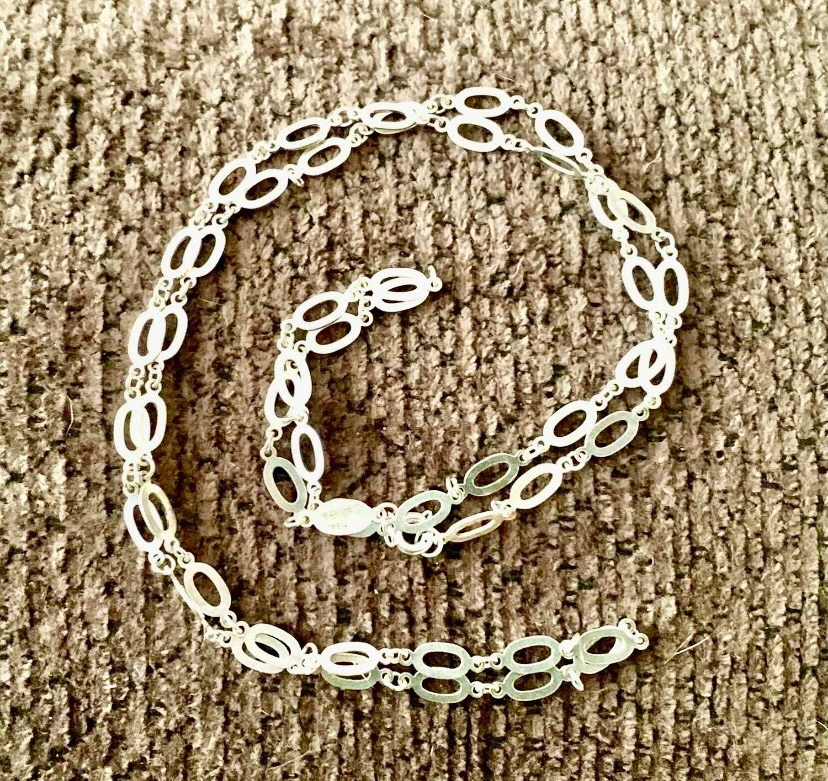 Never worn. 15.50” in length. Sterling silver, circle link style necklace. My Mom purchased this in Mexico in the 50’s. Nice piece to wear alone or layered with other necklaces. Spring ring clasp. No box.