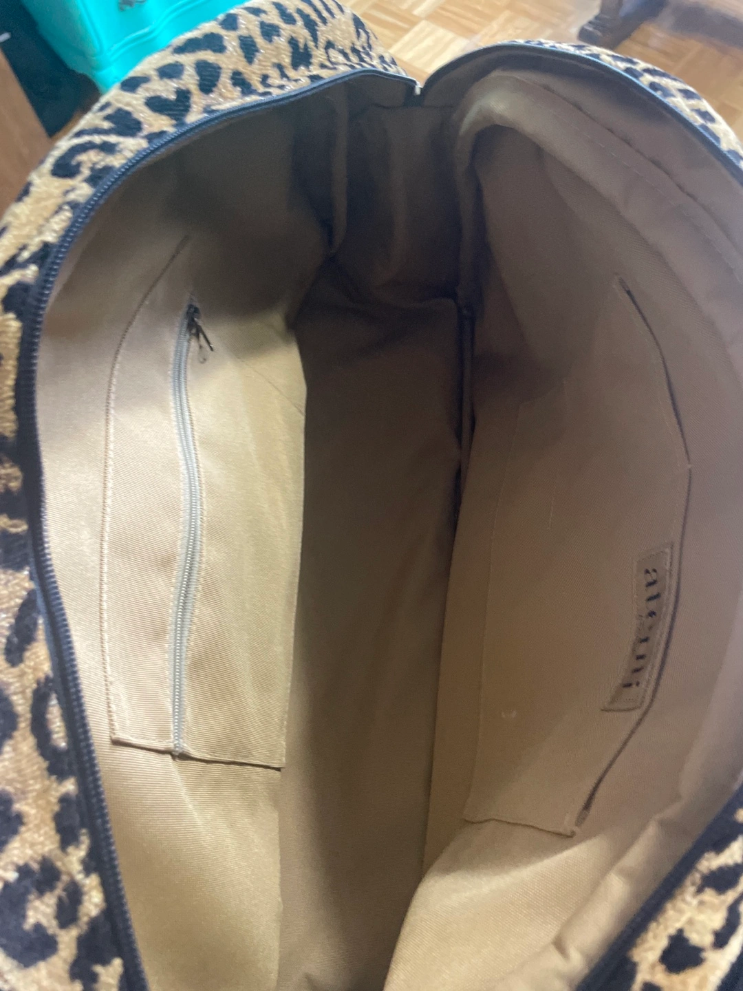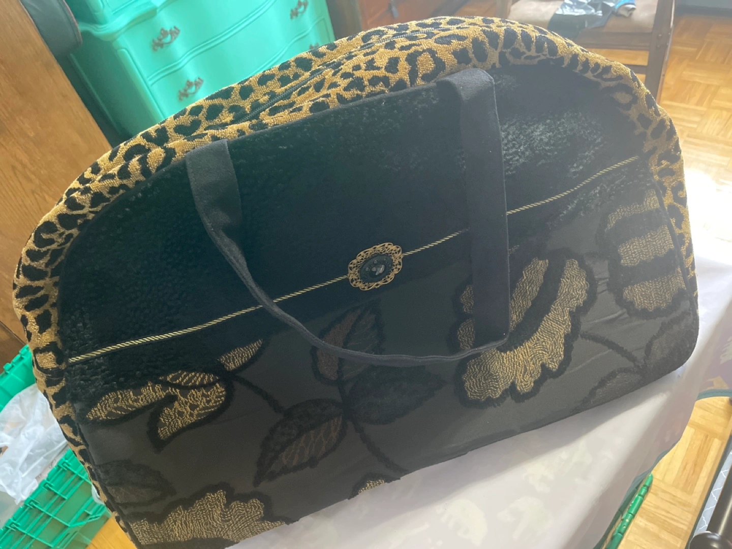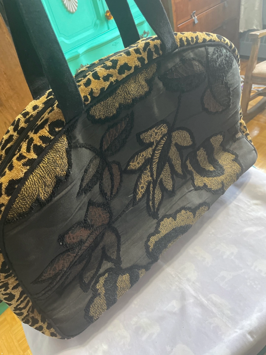 Large travel bag featuring a leopard print design on one side and an embroidered floral design on the other. Has a zipper pocket inside and a decorative gold button.