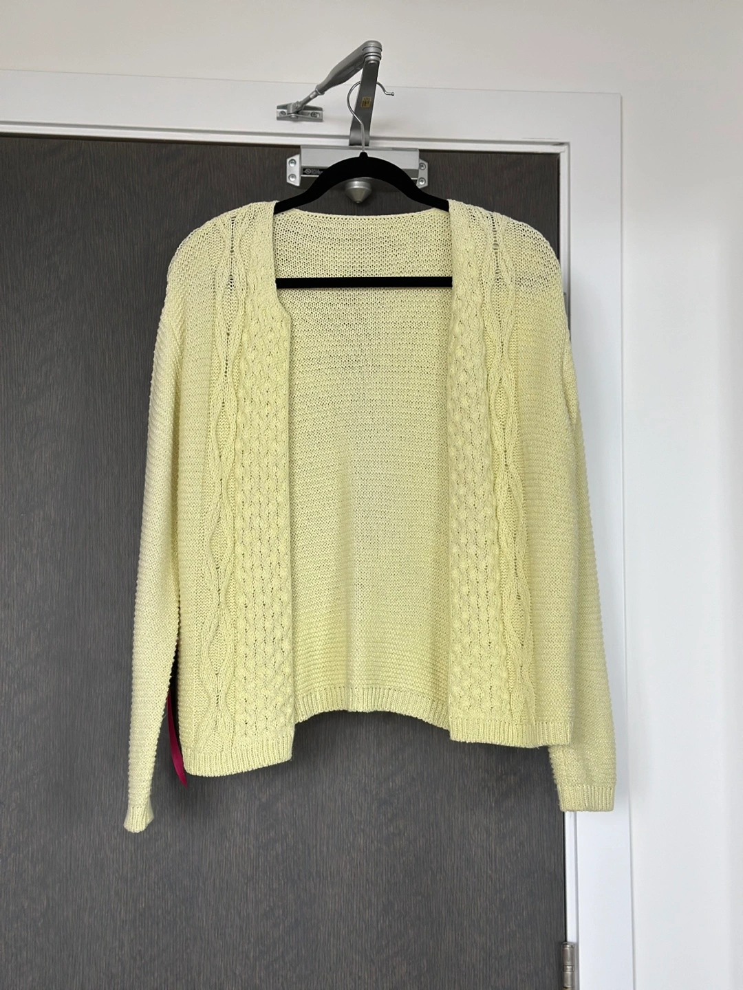 Buy & SellYellow Cable Knit CardiganYellow Cable Knit Cardigan$9Lightweight cardigan with cable knit detail. Long sleeves and a v-neck. Made from a soft knit fabric. No button or zipper.ConditionLike newSizeSBrandKorean generic BrandWHERE TO MEETLoblawsView MapSELLERverifiedHRChurch and Wellesley1418 reviews0 chats·0 favorites·16 views