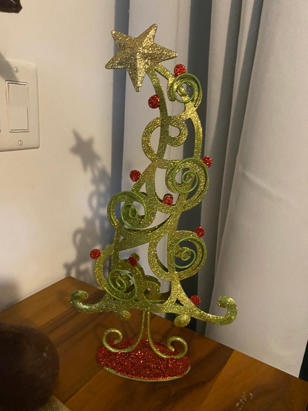 435Green and gold glitter Christmas tree with a star on top. Red glitter accents. Metal stand. Picture Holder
