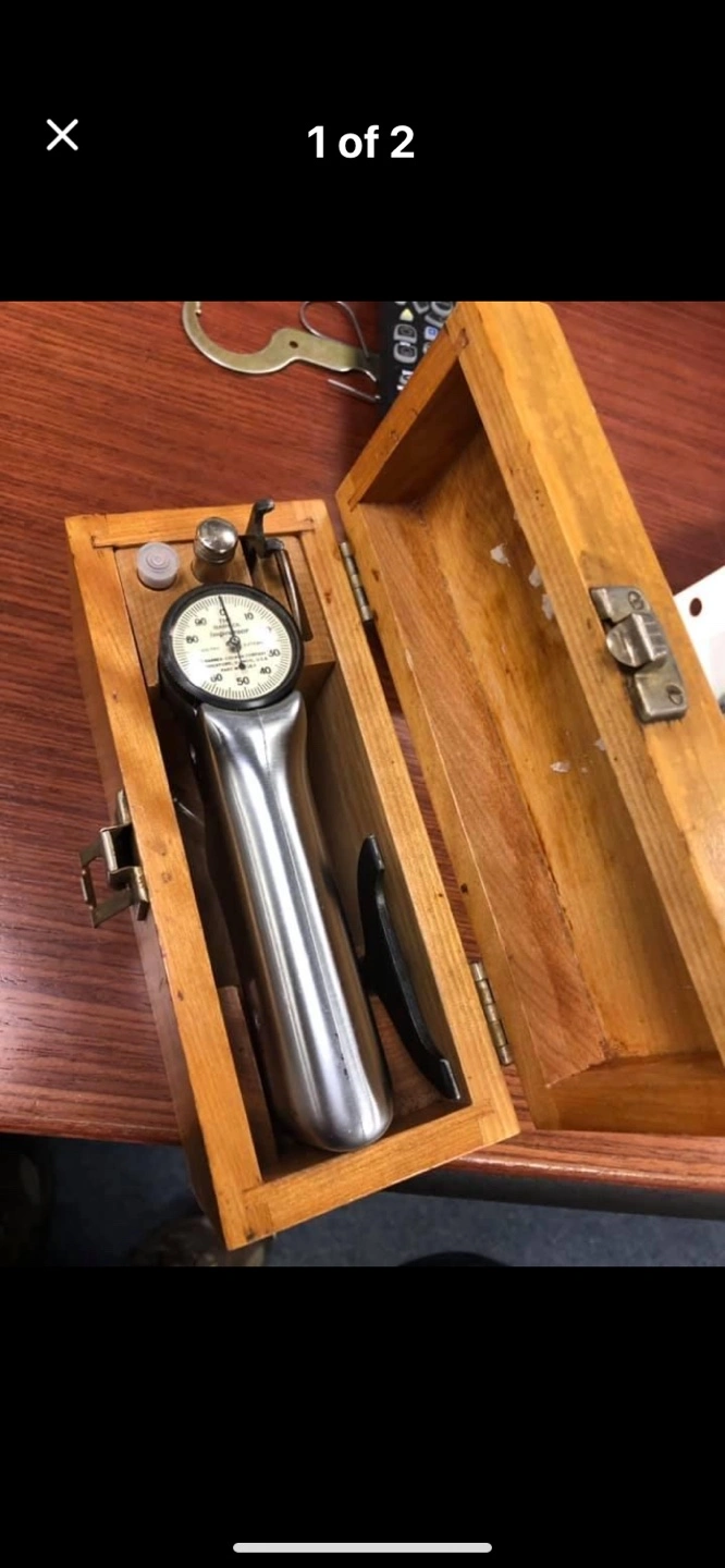 20Vintage tool in wooden box. Includes a gauge with a dial.