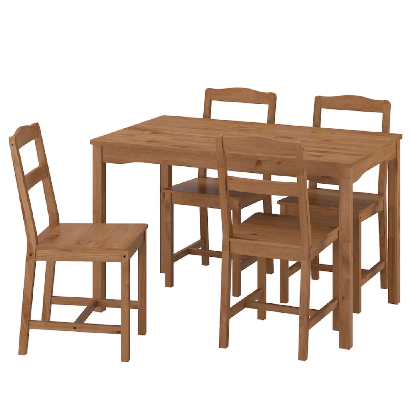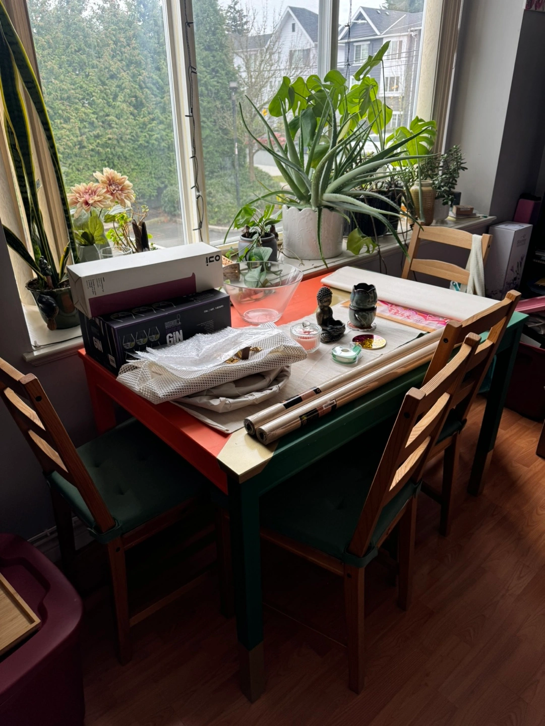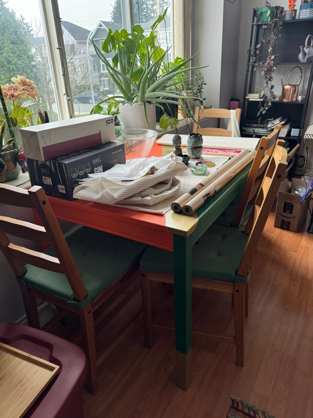IKEA dining table and four chairs. Table is painted in green, orange, and gold. Chairs are natural wood finish with green cushions. No assembly required. Light weight and easy to transport.