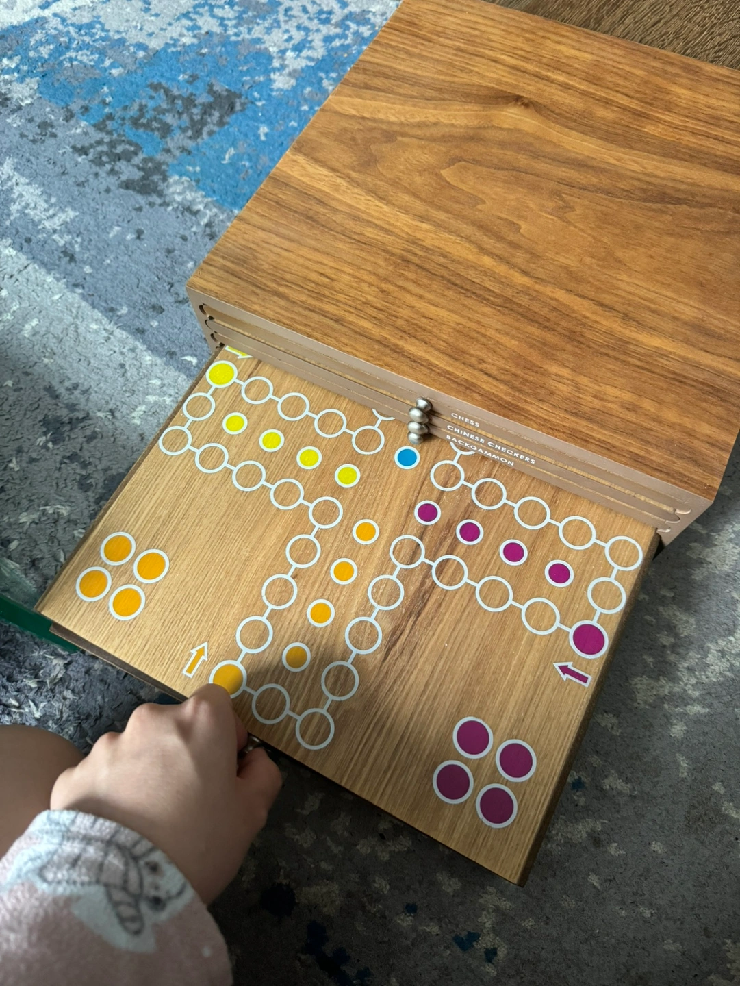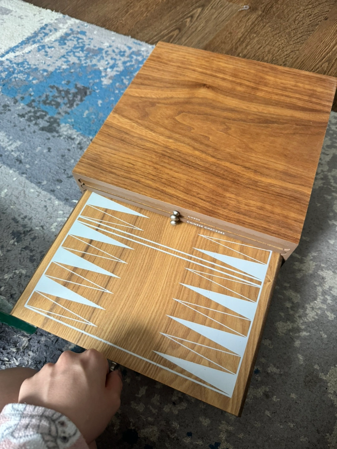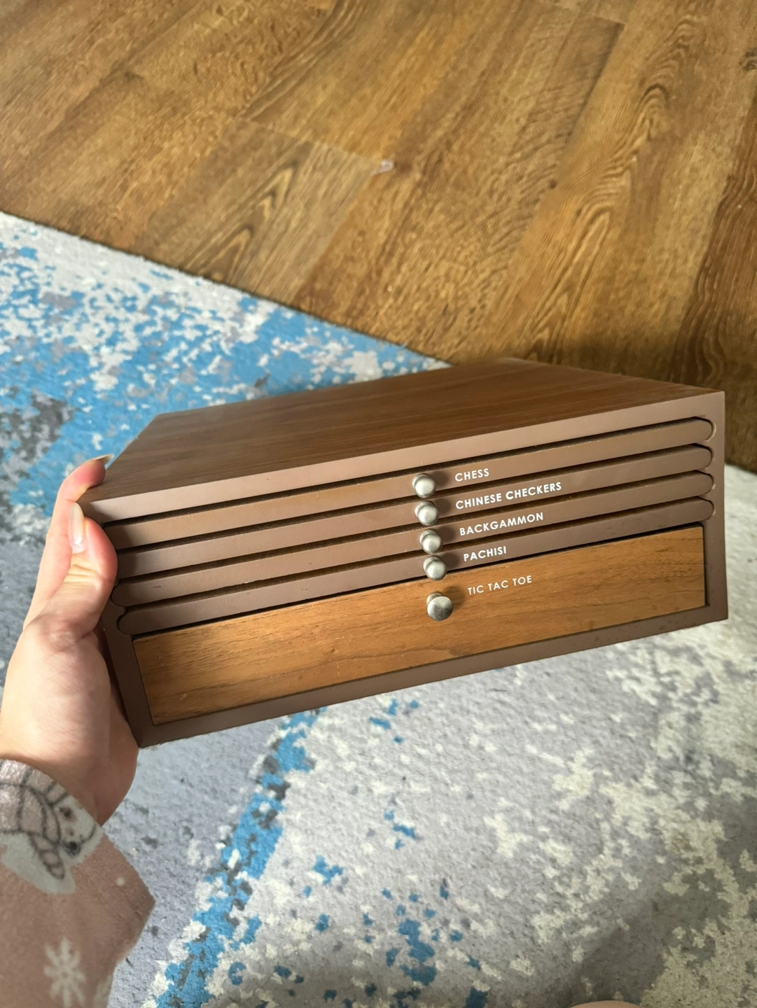 This wooden game set comes with five different games: chess, checkers, backgammon, pachisi, and tic-tac-toe. All games are stored in the same wooden box.