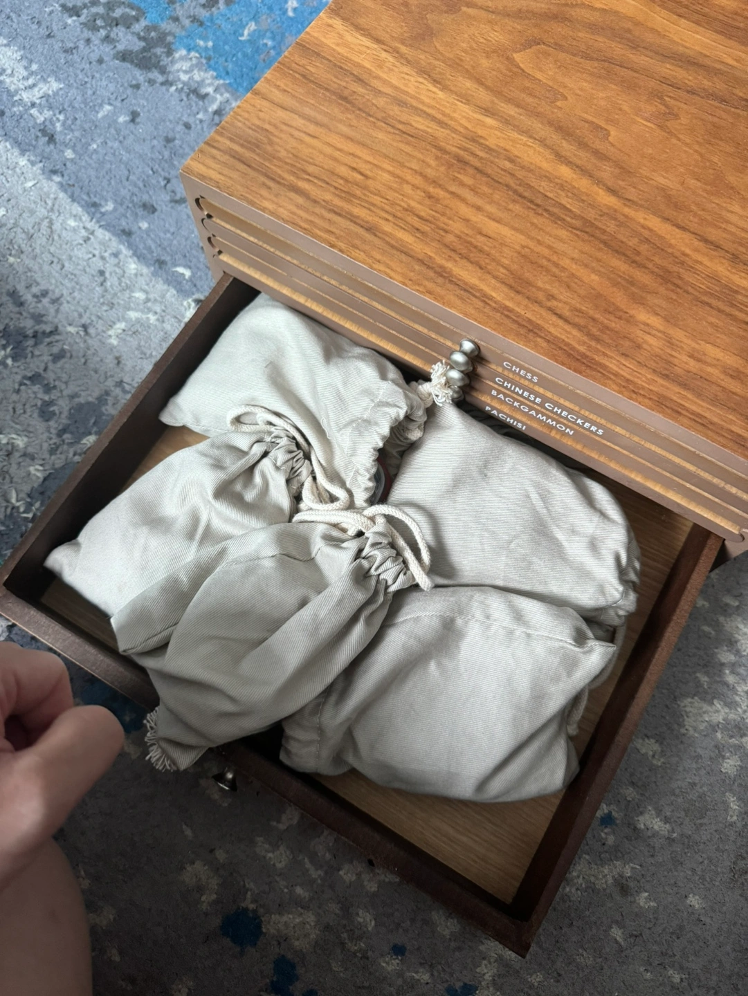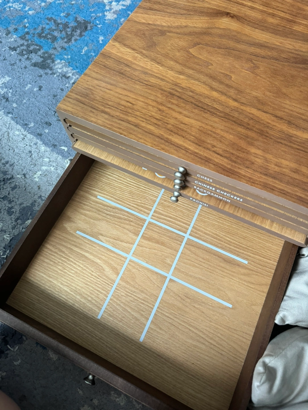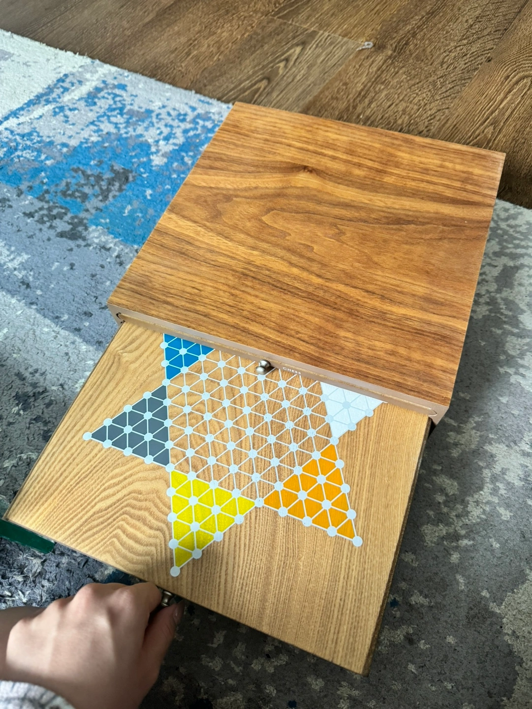 This wooden game set comes with five different games: chess, checkers, backgammon, pachisi, and tic-tac-toe. All games are stored in the same wooden box.