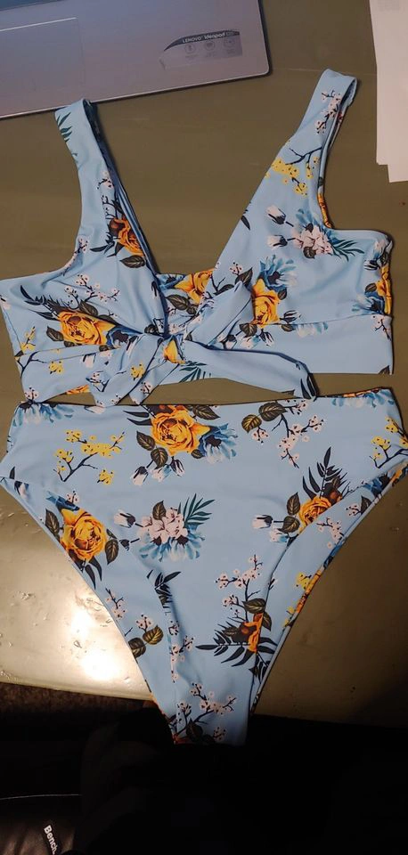 Two-piece bikini with floral pattern.fully lined Blue and yellow colours.