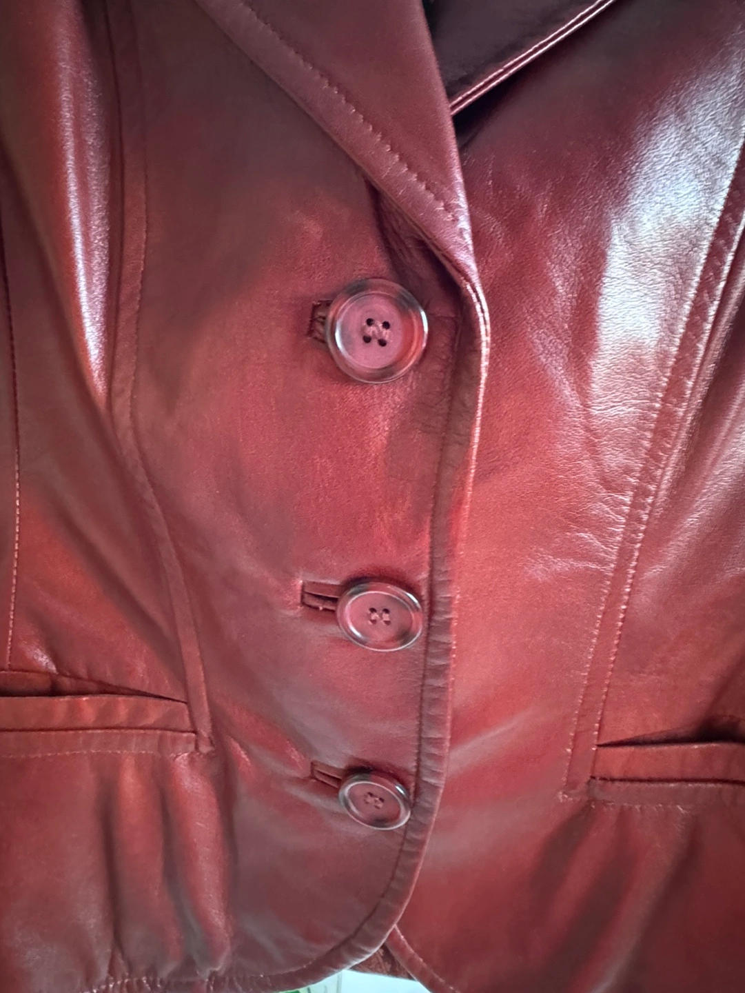 Burgundy leather jacket. Three button closure. Two pockets.