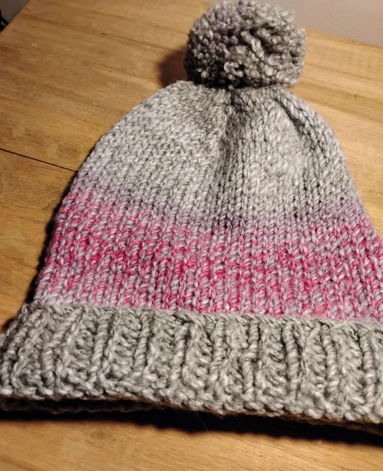Hand-knitted toque with a pom-pom. Grey with pink ombre detail. Warm and cozy for the winter. Made with a wool blend yarn.