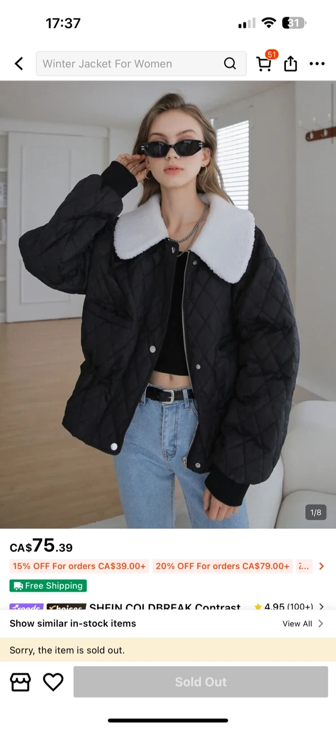SHEIN Dazy Contrast Teddy Collar Quilted Padded Coat - Black