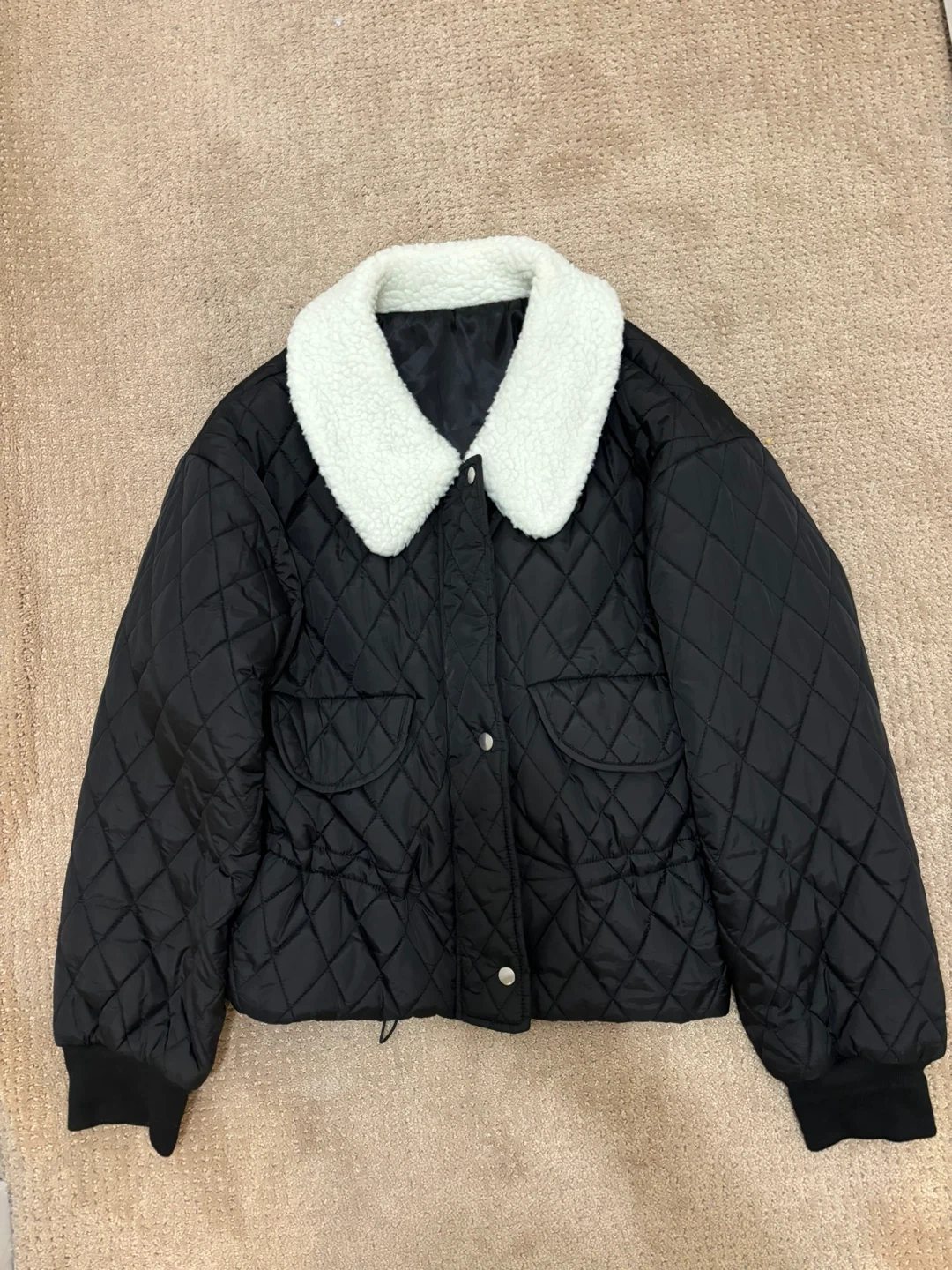 This black quilted padded coat features a contrast teddy collar and a drawstring waist. It has a snap button closure and elastic cuffs.