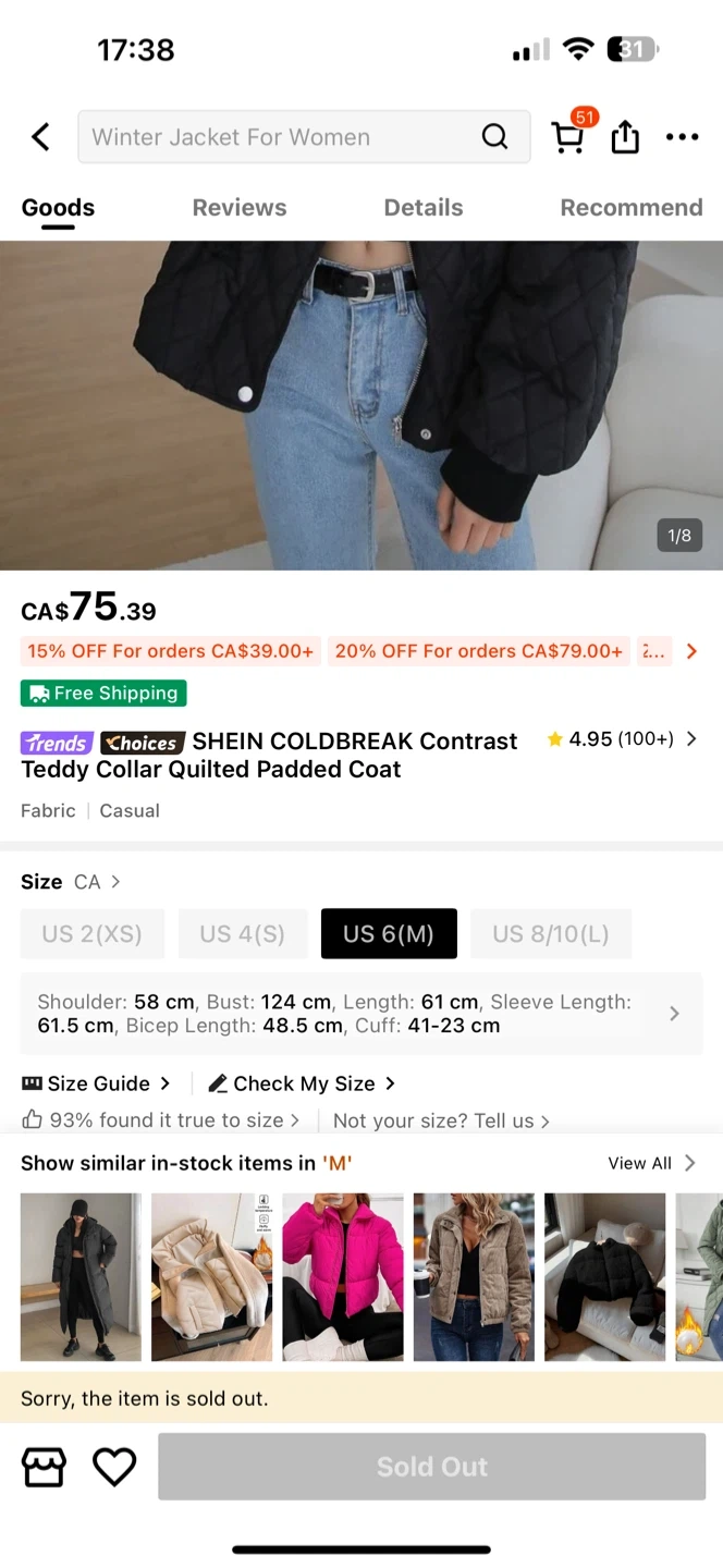 Size is US 6 (M) with shoulder 58 cm, bust 124 cm, and length 61 cm. A cozy jacket for cooler weather!