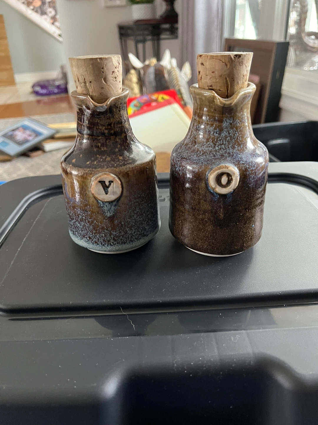 Vintage stoneware Two small cruets with cork stoppers, one marked 'V' and the other 'O'. These would be handy for salad dressings or cooking oils. They're made stoneware with a speckled brown and blue finish.