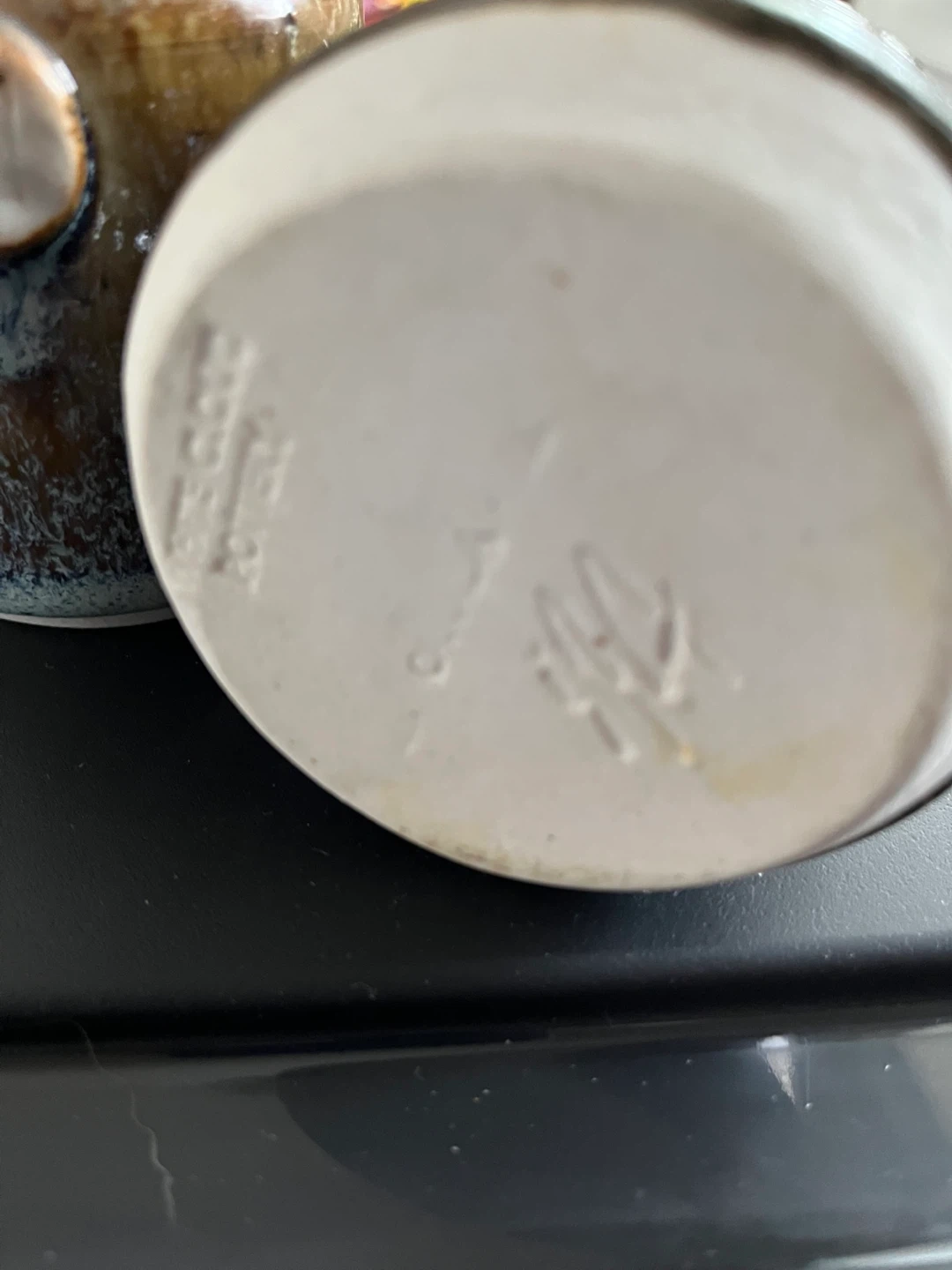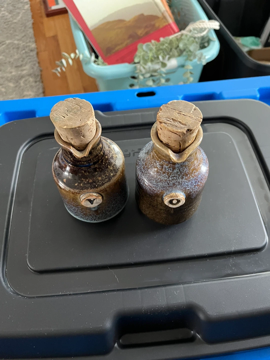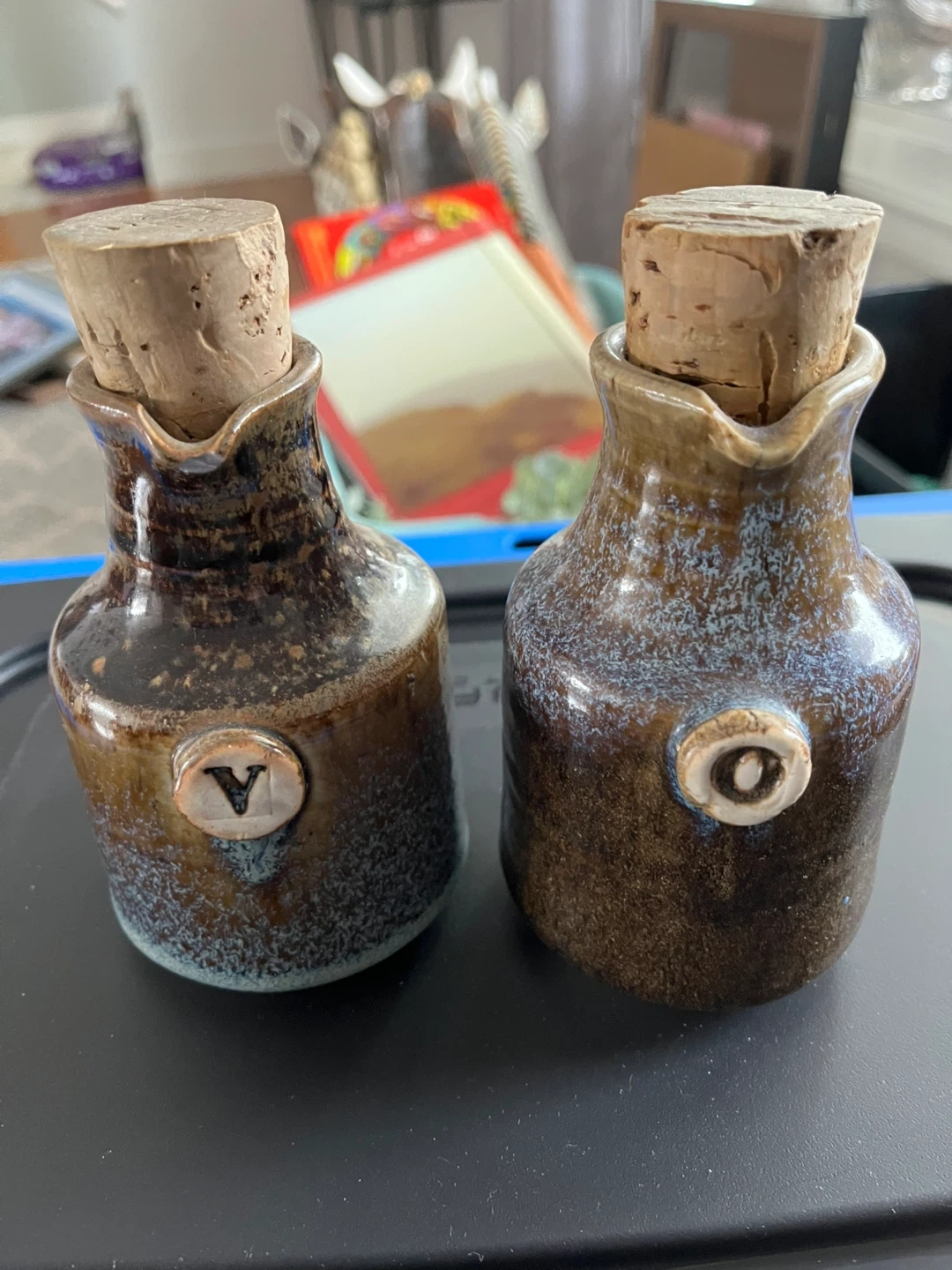 Vintage stoneware Two small cruets with cork stoppers, one marked 'V' and the other 'O'. These would be handy for salad dressings or cooking oils. They're made stoneware with a speckled brown and blue finish.