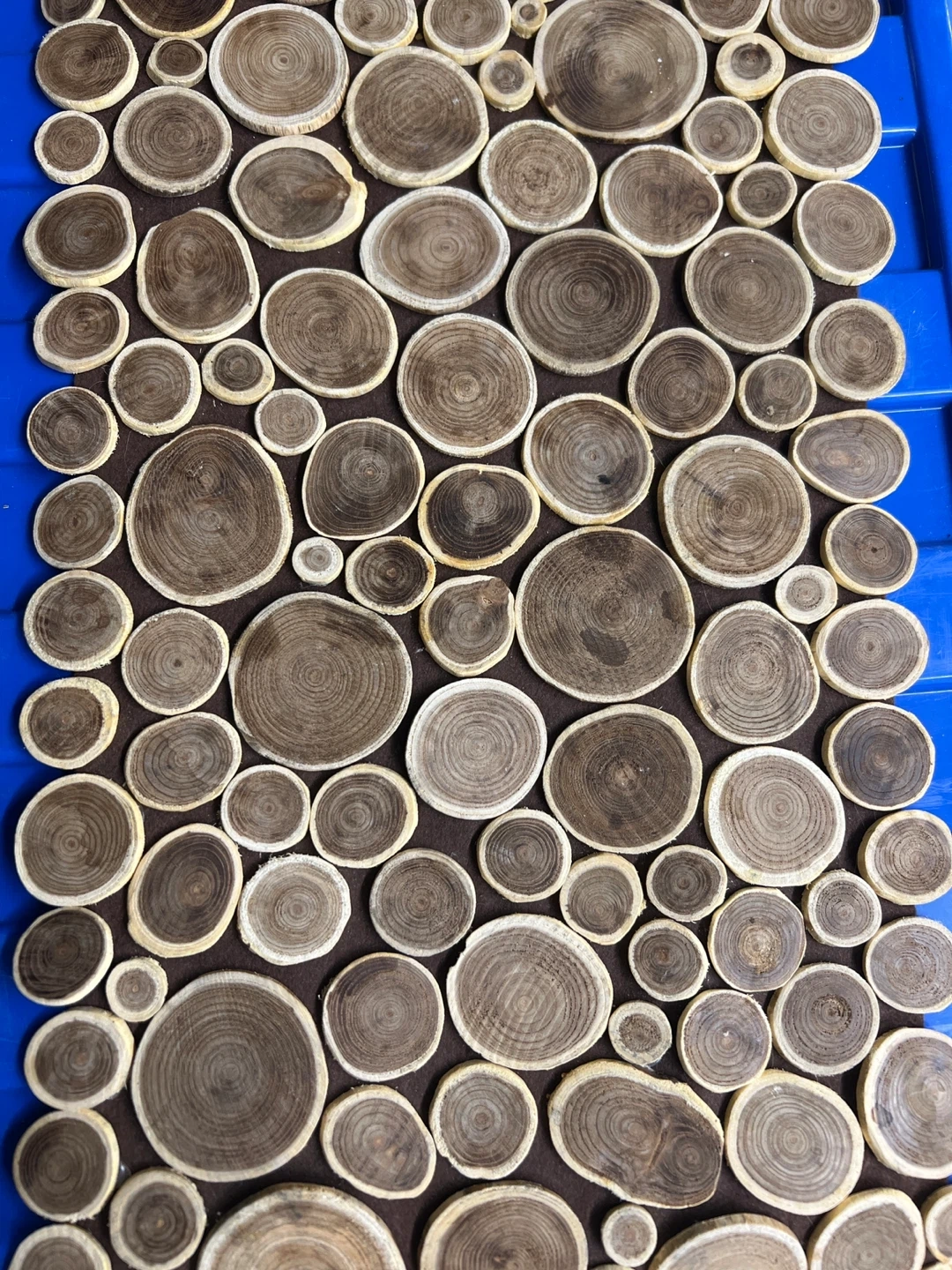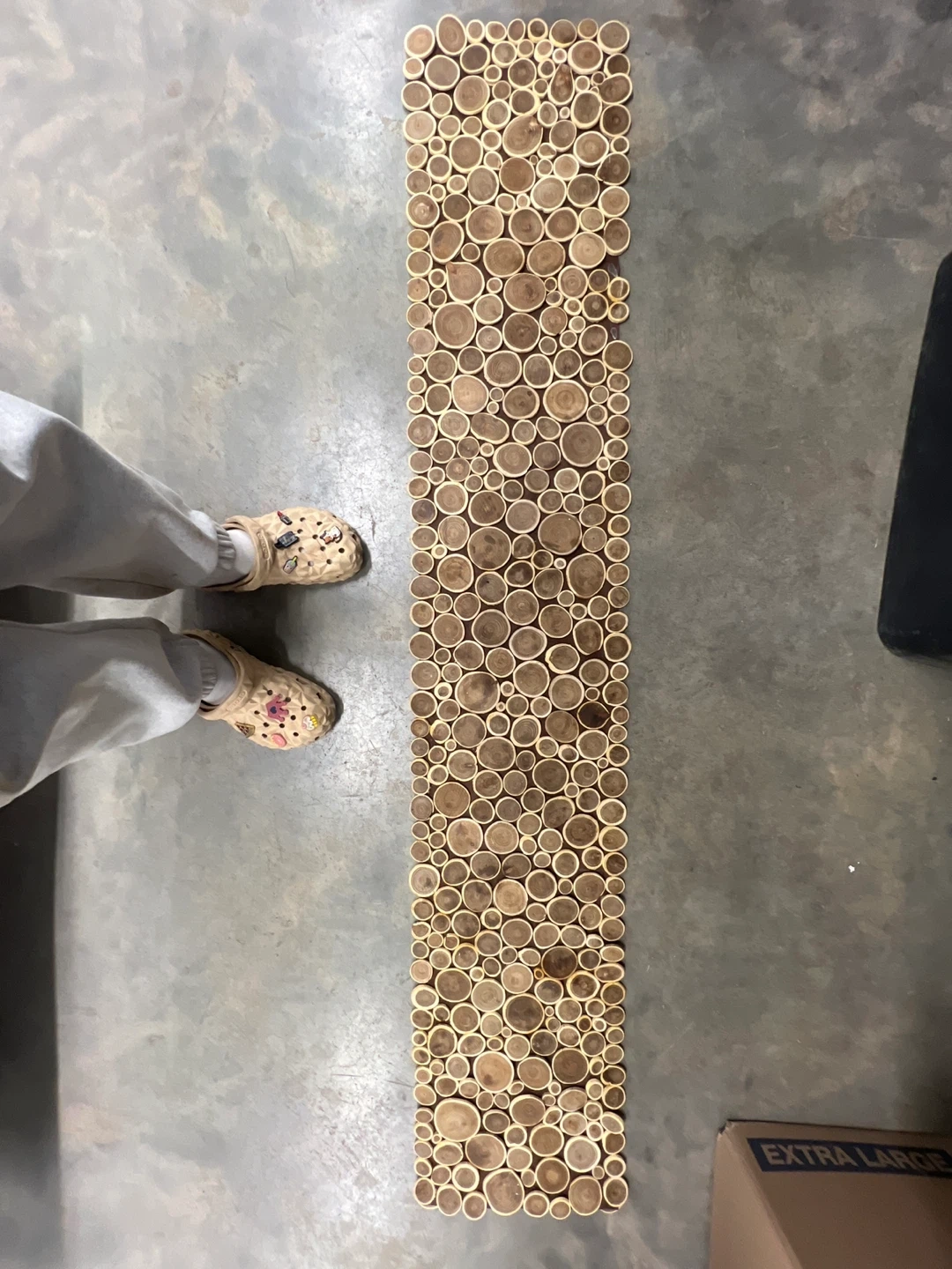 A unique table runner made from many small wood slices. It's a rustic and natural accent for your home décor. Adds a touch of the outdoors to any setting!