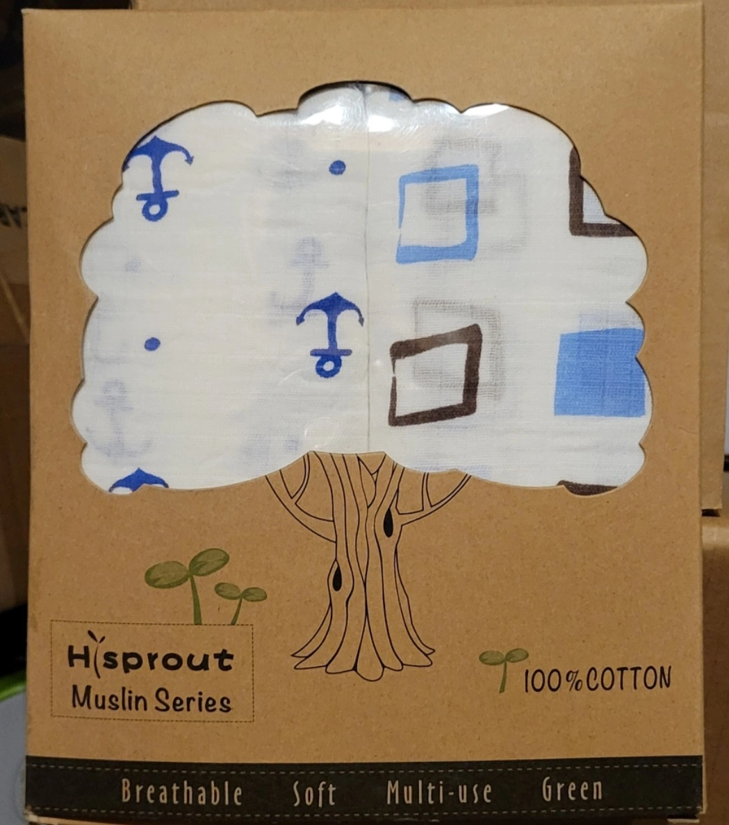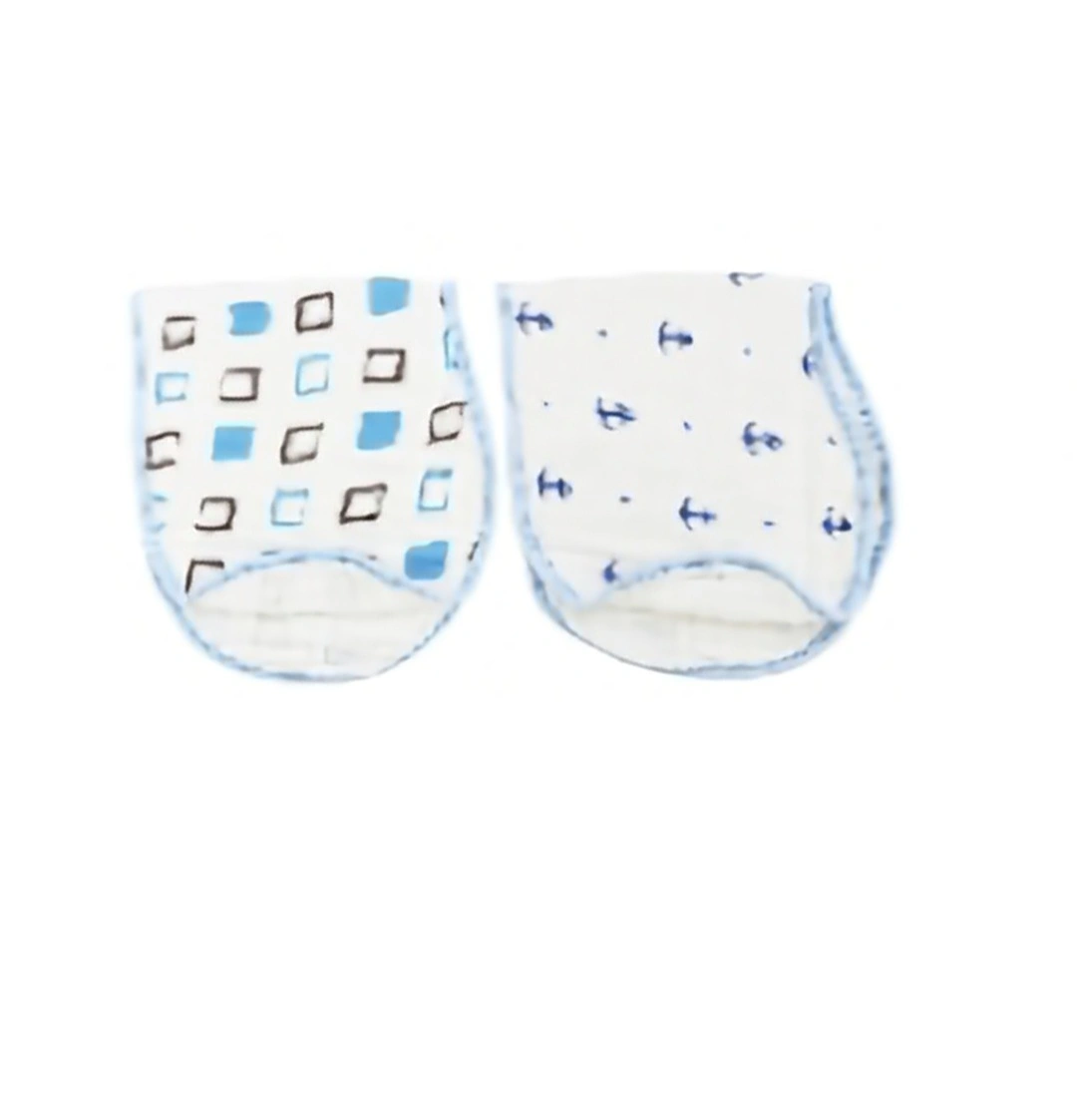 89Set of two Muslin Swaddles. One has a geometric pattern, the other has anchors.