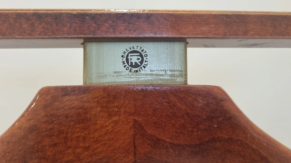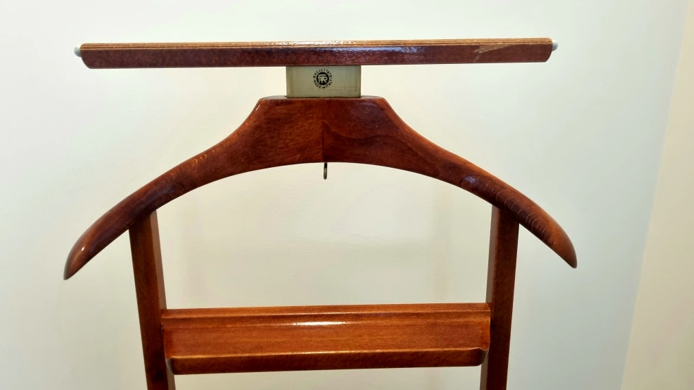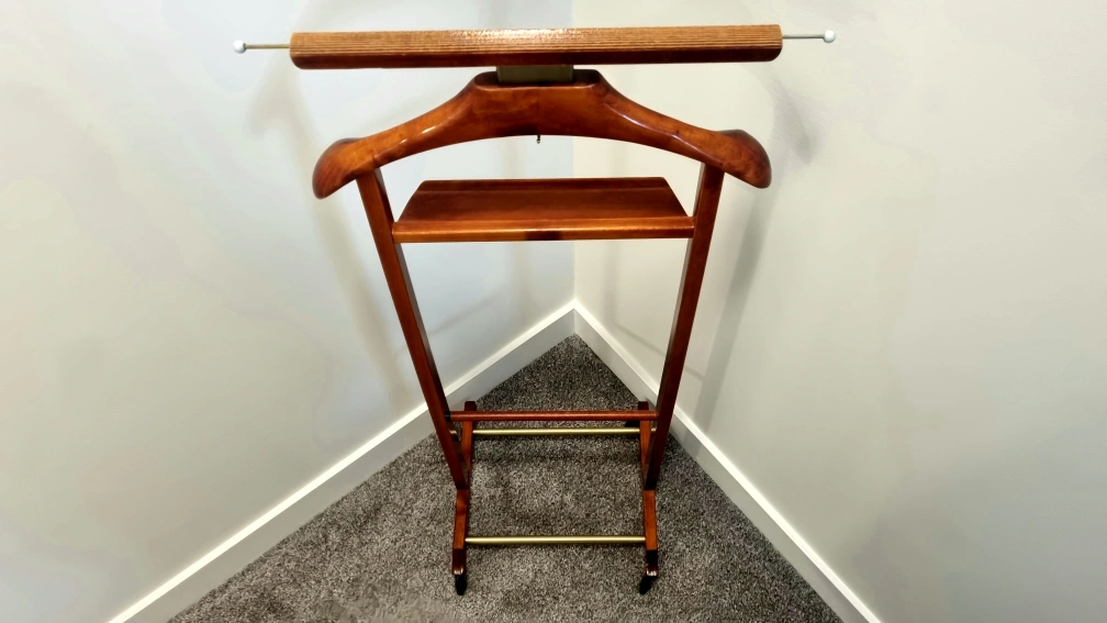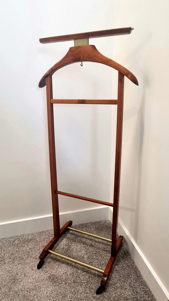 109Wooden valet stand with a top shelf, hanging rack, and two lower shelves. Has wheels for easy movement. Made in Italy.